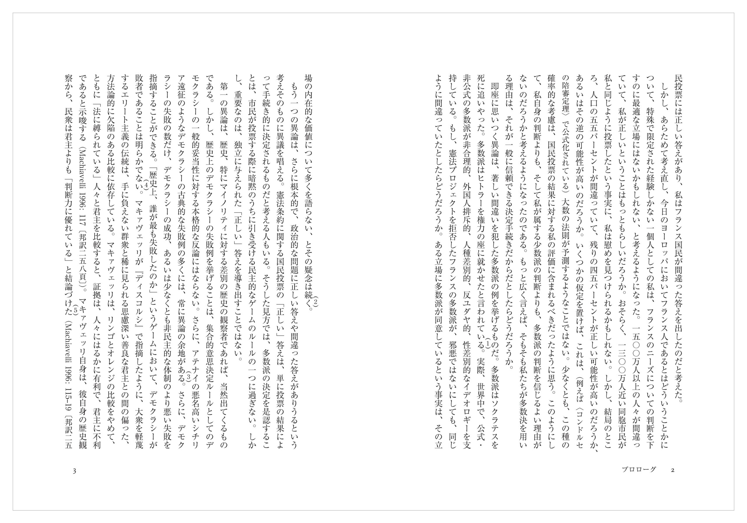 しかし、あらためて考え直し、今日のヨーロッパにおいてフランス人であるとはどういうことかについて、特殊で限定された経験しかない一個人としての私は、フランスのニーズについての判断を下すのに最適な立場にはないかもしれない、と考えるようになった。一五〇〇万人以上の人々が間違っていて、私が正しいということはもっともらしいだろうか。おそらく、一三〇〇万人近い同胞市民が私と同じように投票したという事実に、私は慰めを見つけられるかもしれない。しかし、結局のところ、人口の五五パーセントが間違っていて、残りの四五パーセントが正しい可能性が高いのだろうか、あるいはその逆の可能性が高いのだろうか。いくつかの仮定を置けば、これは、(例えば〈コンドルセの陪審定理〉で公式化されている)大数の法則が予測するようなことではない。少なくとも、この種の確率的な考慮は、国民投票の結果に対する私の評価に含まれるべきだったように思う。このようにして、私自身の判断よりも、そして私が属する少数派の判断よりも、多数派の判断を信じるよい理由がないのだろうかと考えるようになったのである。もっと広く言えば、そもそも私たちが多数決を用いる理由は、それが一般に信頼できる決定手続きだからだとしたらどうだろうか。
