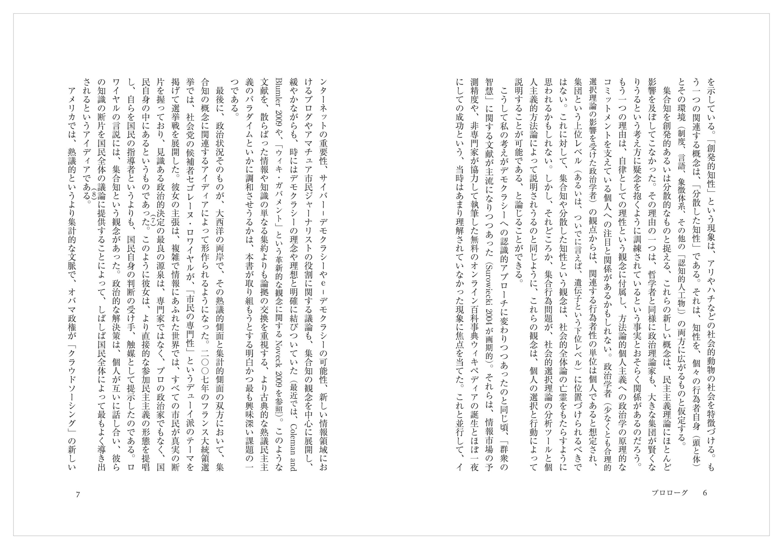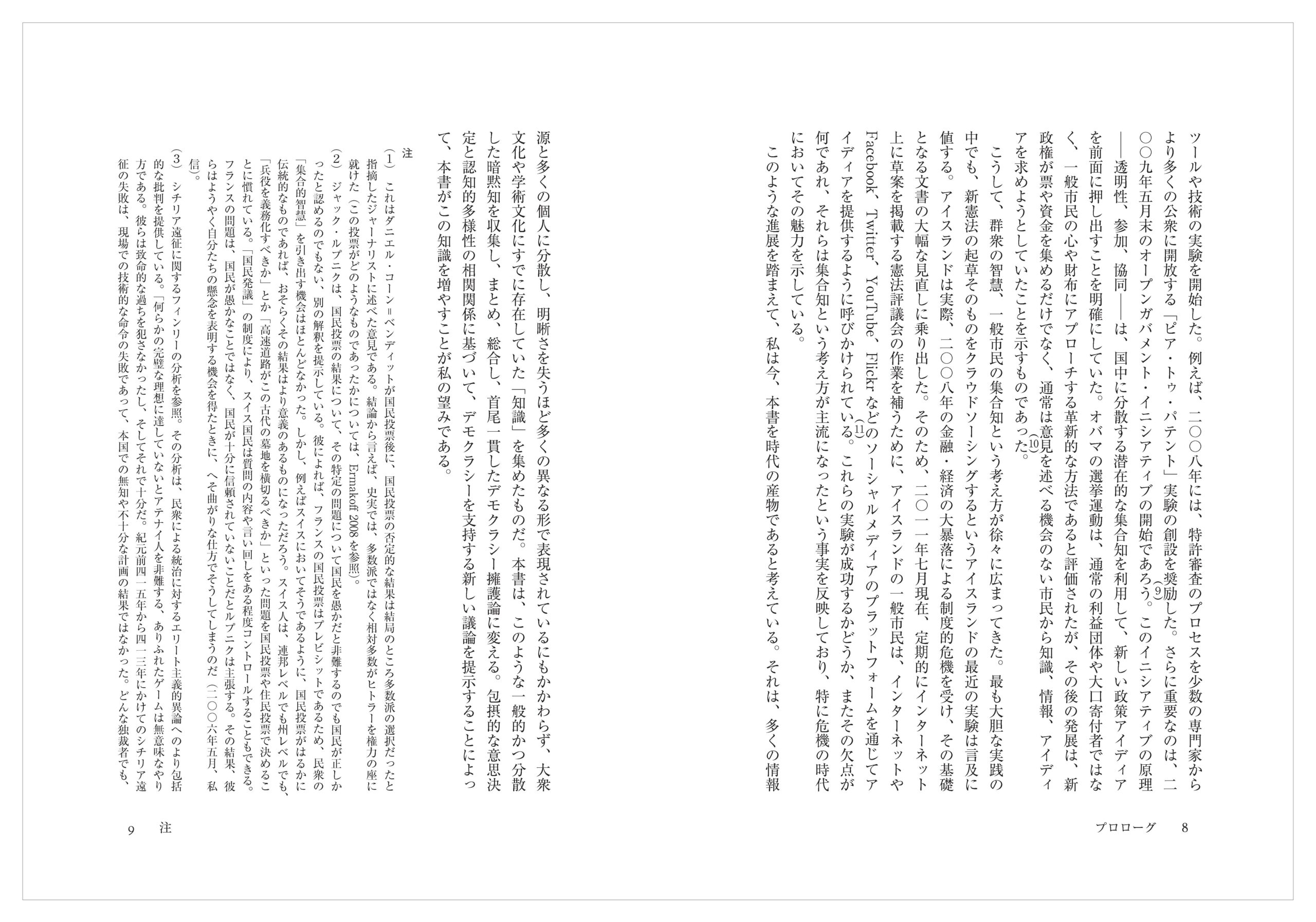 このような進展を踏まえて、私は今、本書を時代の産物であると考えている。それは、多くの情報源と多くの個人に分散し、明晰さを失うほど多くの異なる形で表現されているにもかかわらず、大衆文化や学術文化にすでに存在していた「知識」を集めたものだ。本書は、このような一般的かつ分散した暗黙知を収集し、まとめ、総合し、首尾一貫したデモクラシー擁護論に変える。包摂的な意思決定と認知的多様性の相関関係に基づいて、デモクラシーを支持する新しい議論を提示することによって、本書がこの知識を増やすことが私の望みである。