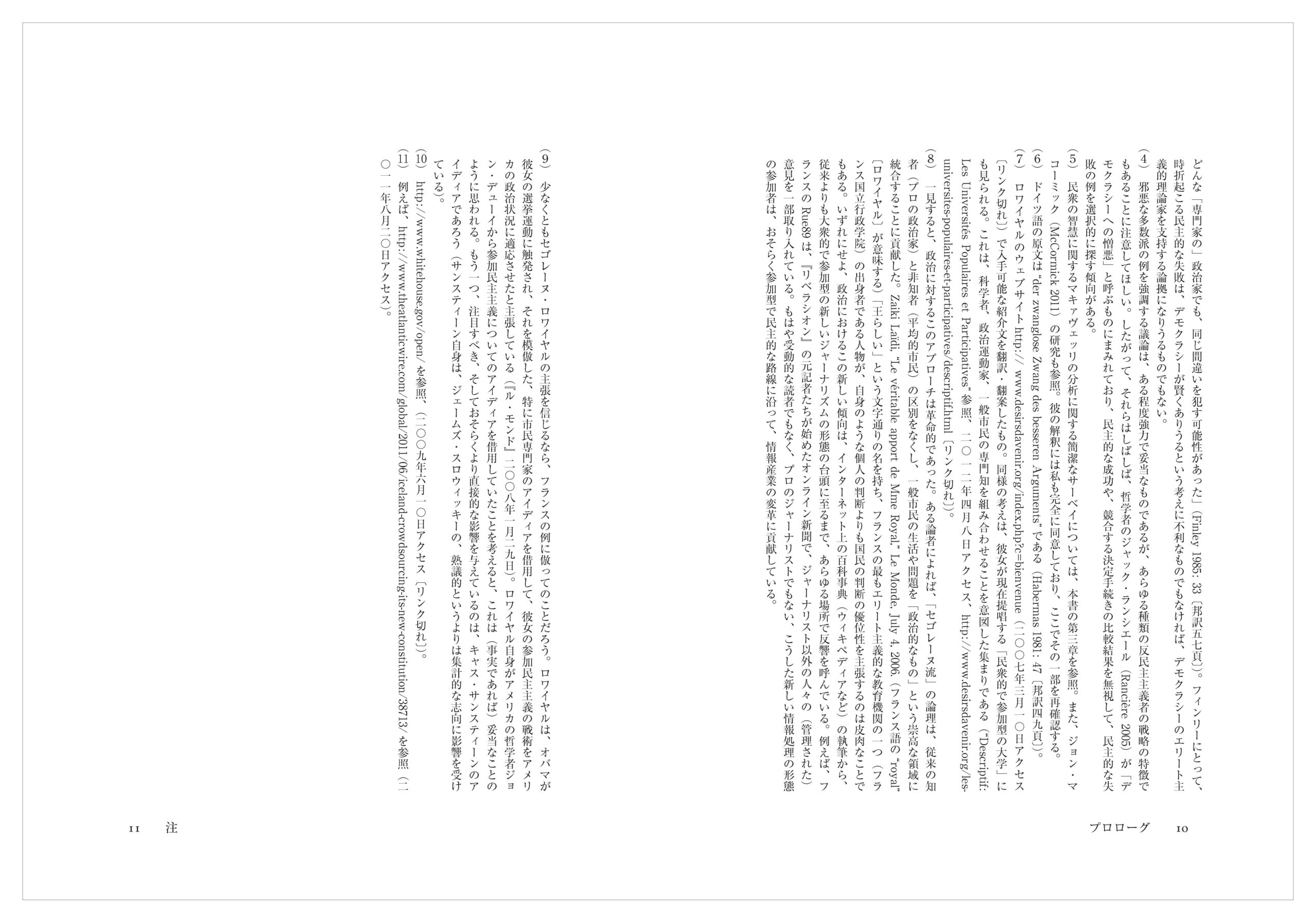こうして私の考えがデモクラシーへの認識的アプローチに変わりつつあったのと同じ頃、「群衆の智慧」に関する文献が主流になりつつあった(Surowiecki 2004 が画期的)。それらは、情報市場の予測精度や、非専門家が協力して執筆した無料のオンライン百科事典ウィキペディアの誕生とほぼ一夜にしての成功という、当時はあまり理解されていなかった現象に焦点を当てた。これと並行して、インターネットの重要性、サイバー-デモクラシーやe-デモクラシーの可能性、新しい情報領域におけるブログやアマチュア市民ジャーナリストの役割に関する議論も、集合知の観念を中心に展開し、緩やかながらも、時にはデモクラシーの理念や理想と明確に結びついていた(最近では、Coleman and Blumler 2009 や、「ウィキ・ガバメント」という革新的な観念に関するNoveck 2009 を参照)。このような文献を、散らばった情報や知識の単なる集約よりも論拠の交換を重視する、より古典的な熟議民主主義のパラダイムといかに調和させうるかは、本書が取り組もうとする明白かつ最も興味深い課題の一つである。