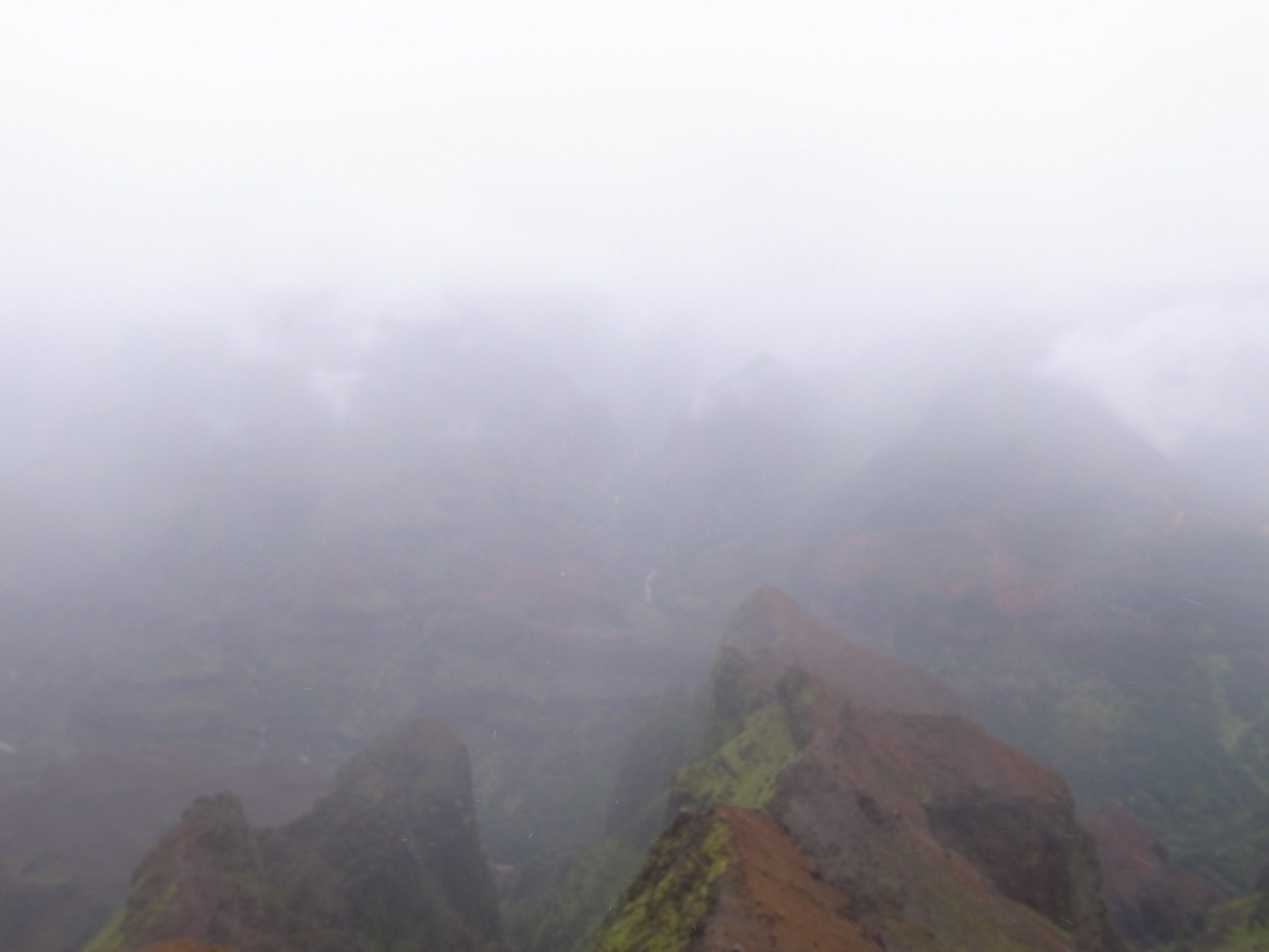 You can’t always expect to actually see the exceptionally beautiful scenery. Don’t think your journey was wasted! The joy lies in what remains hidden. Puu Hinahina Lookout on the island of Kauai.