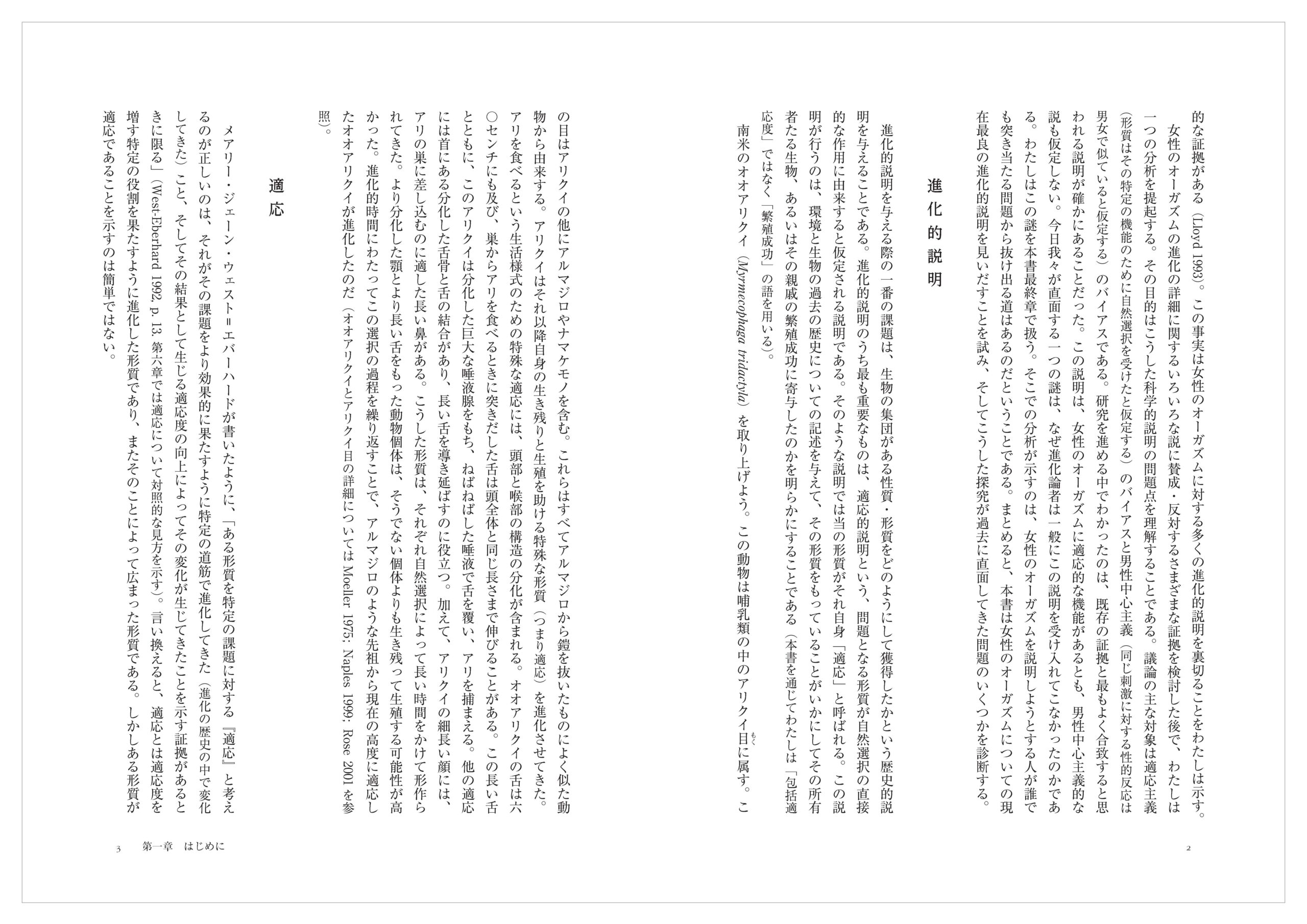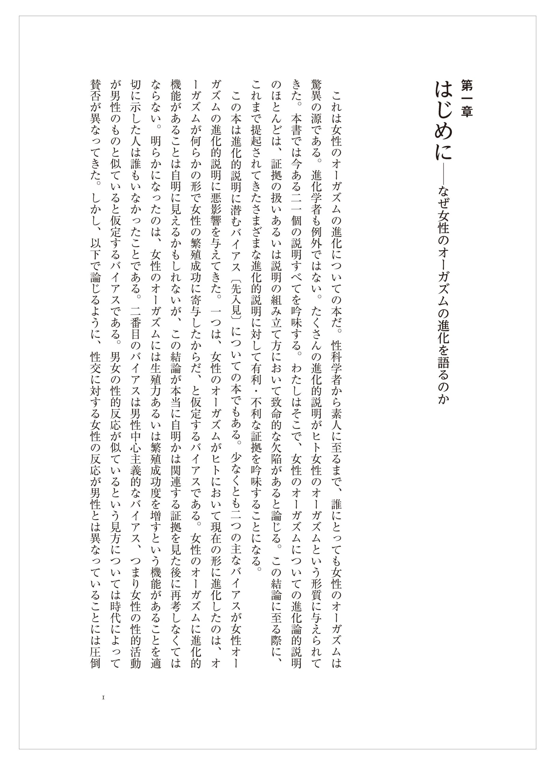 この本は進化的説明に潜むバイアス〔先入見〕についての本でもある。少なくとも二つの主なバイアスが女性オーガズムの進化的説明に悪影響を与えてきた。一つは、女性のオーガズムがヒトにおいて現在の形に進化したのは、オーガズムが何らかの形で女性の繁殖成功に寄与したからだ、と仮定するバイアスである。女性のオーガズムに進化的機能があることは自明に見えるかもしれないが、この結論が本当に自明かは関連する証拠を見た後に再考しなくてはならない。明らかになったのは、女性のオーガズムには生殖力あるいは繁殖成功度を増すという機能があることを適切に示した人は誰もいなかったことである。二番目のバイアスは男性中心主義的なバイアス、つまり女性の性的活動が男性のものと似ていると仮定するバイアスである。男女の性的反応が似ているという見方については時代によって賛否が異なってきた。しかし、以下で論じるように、性交に対する女性の反応が男性とは異なっていることには圧倒的な証拠がある(Lloyd 1993)。この事実は女性のオーガズムに対する多くの進化的説明を裏切ることをわたしは示す。