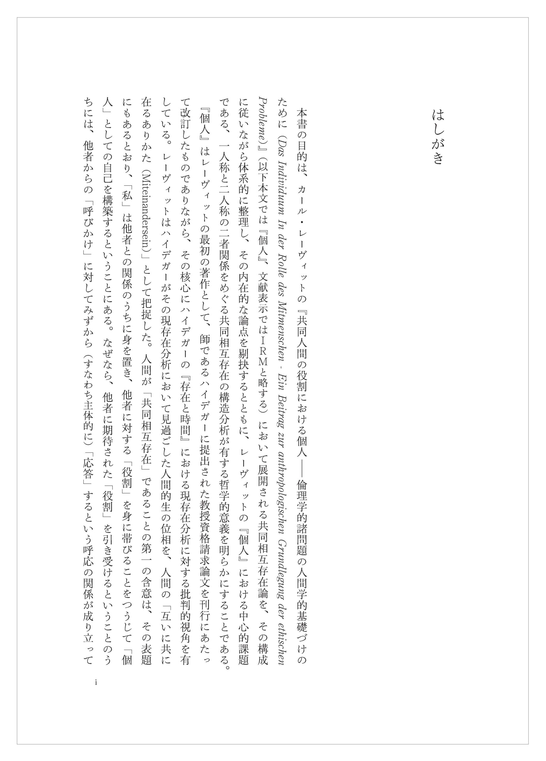 本書の目的は、カール・レーヴィットの『共同人間の役割における個人―倫理学的諸問題の人間学的基礎づけのために(Das Individuum In der Rolle des Mitmenschen – Ein Beitrag zur anthropologischen Grundlegung der ethischen Probleme)』(以下本文では『個人』、文献表示ではIRMと略する)において展開される共同相互存在論を、その構成に従いながら体系的に整理し、その内在的な論点を剔抉するとともに、レーヴィットの『個人』における中心的課題である、一人称と二人称の二者関係をめぐる共同相互存在の構造分析が有する哲学的意義を明らかにすることである。