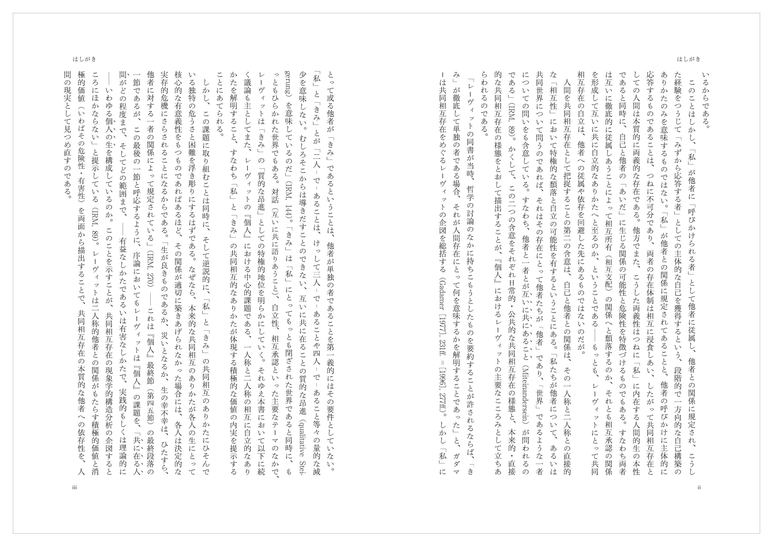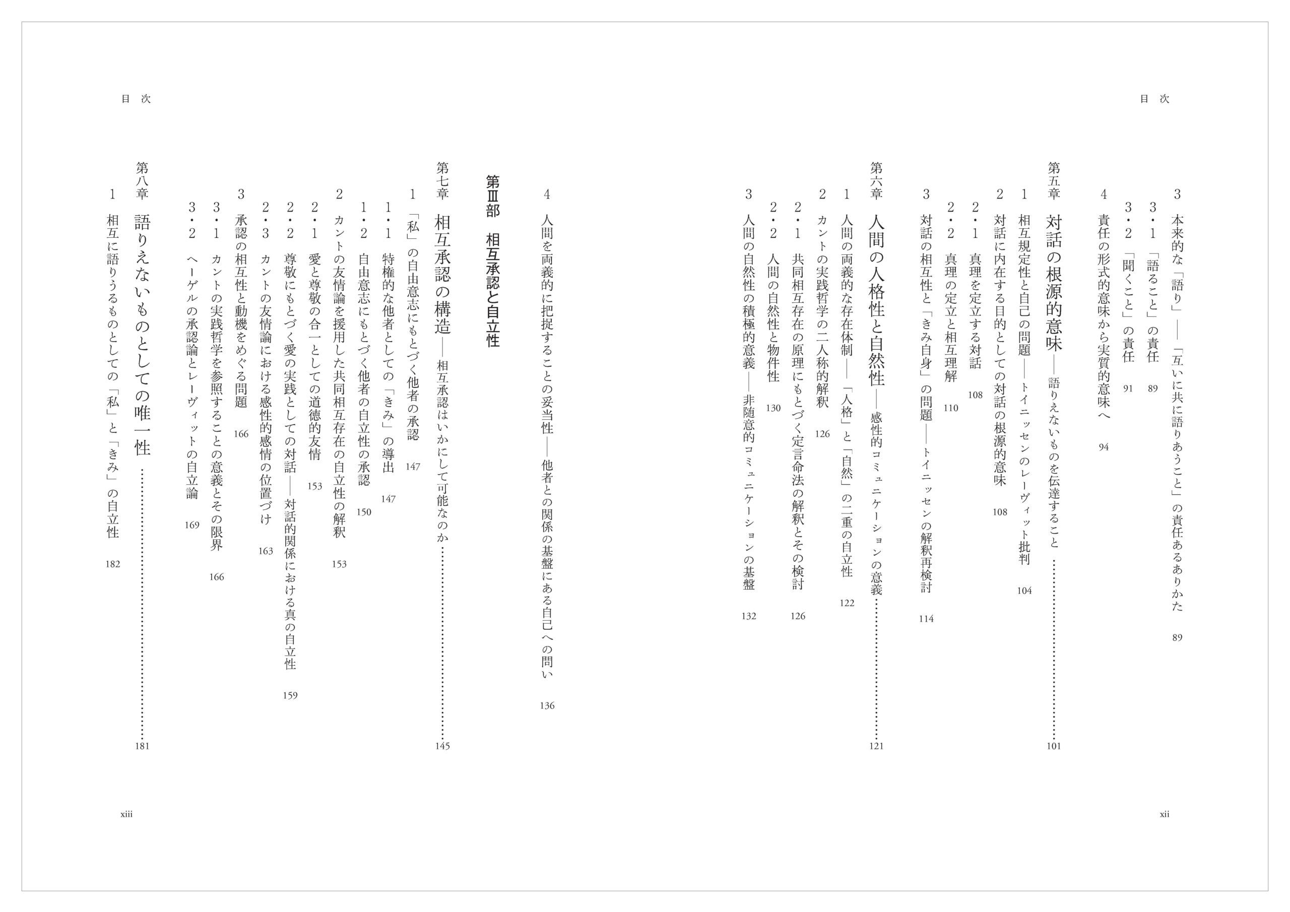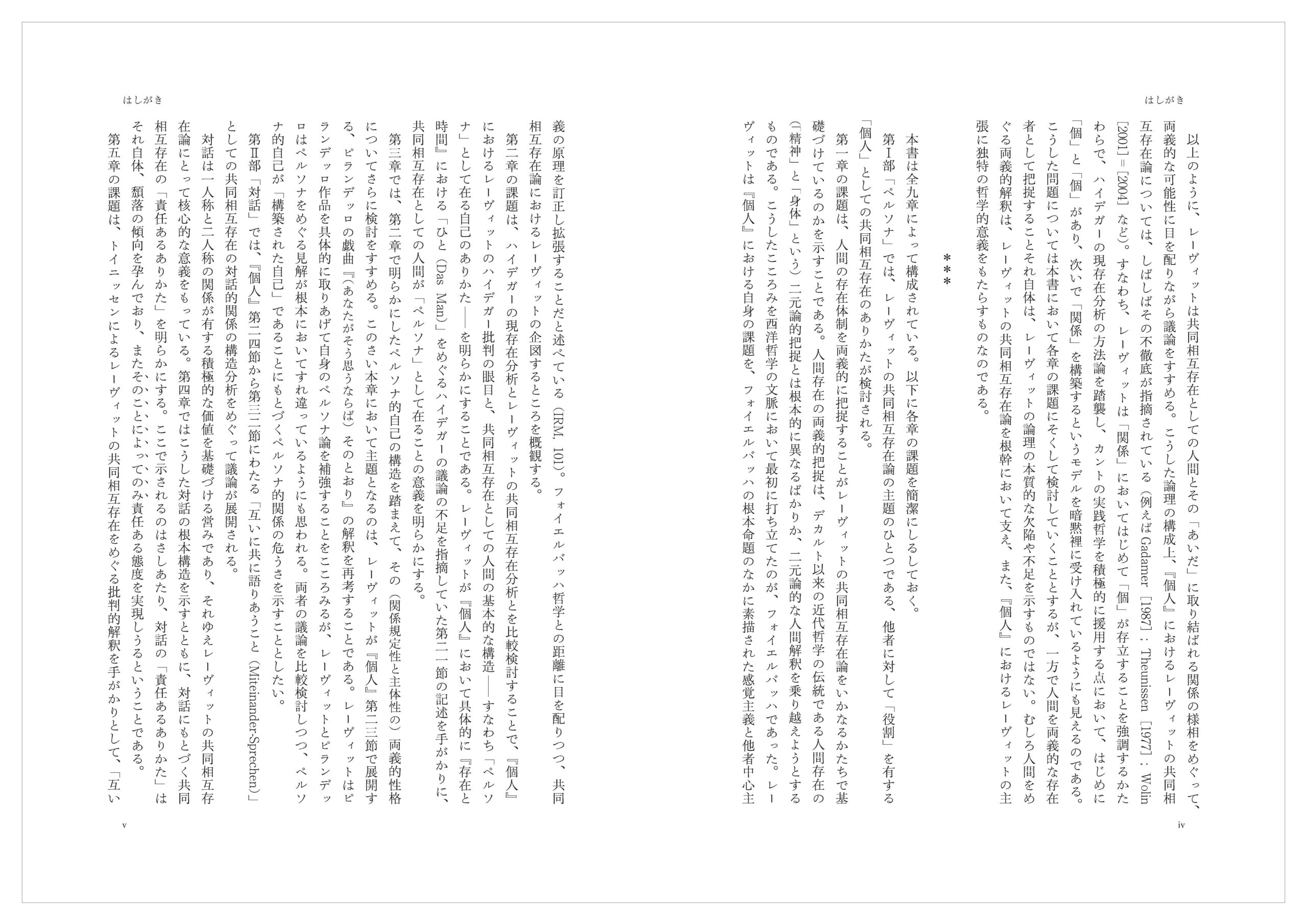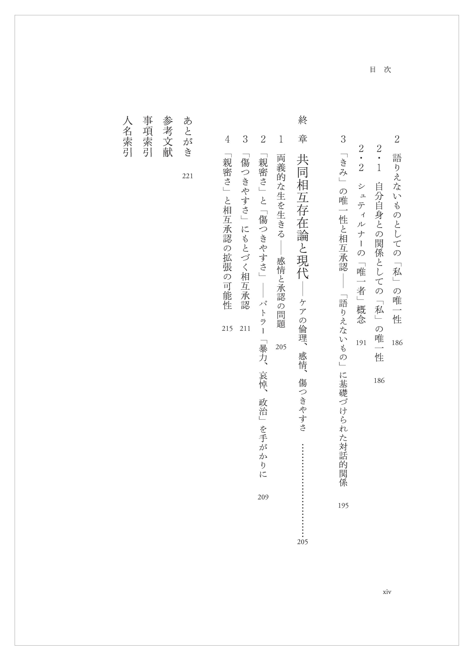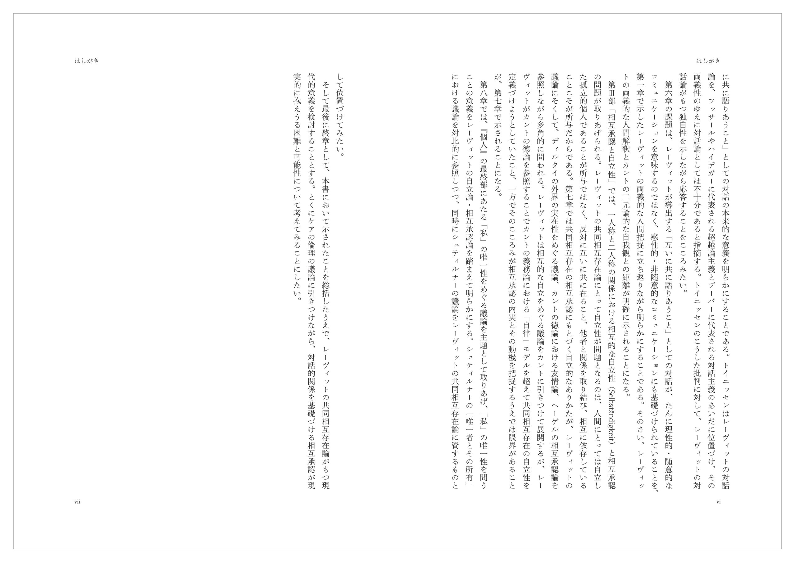 そして最後に終章として、本書において示されたことを総括したうえで、レーヴィットの共同相互存在論がもつ現代的意義を検討することとする。とくにケアの倫理の議論に引きつけながら、対話的関係を基礎づける相互承認が現実的に抱えうる困難と可能性について考えてみることにしたい。