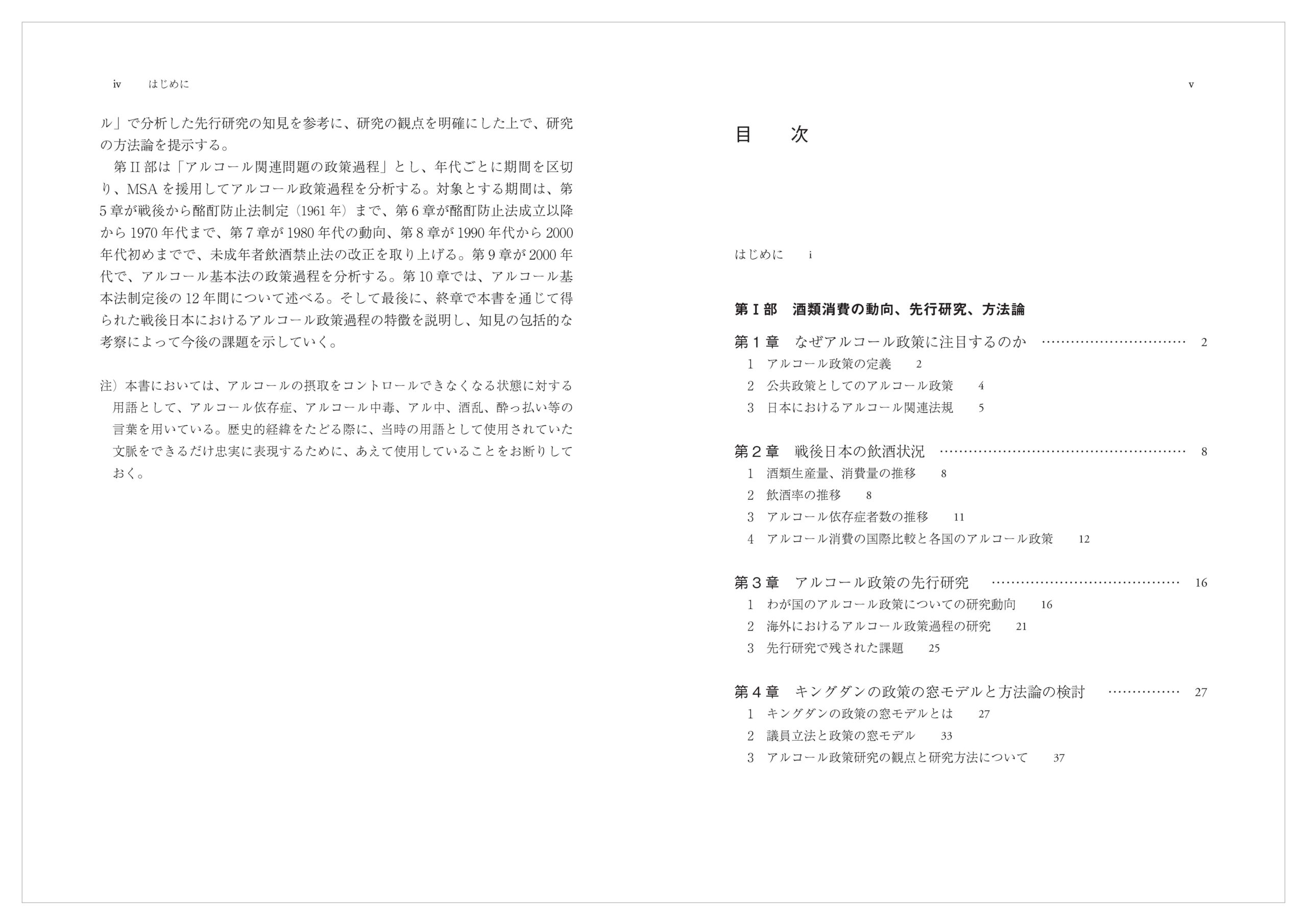 最後に、本書の構成について述べておく。第I 部は「酒類消費の動向、先行研究、方法論」とし、日本の飲酒関連法規や飲酒率の変遷を押さえた上で、アルコール政策研究の先行研究と方法論について検討する。第1 章で問題関心を説明する。その上で、アルコール政策を定義し、事例とする日本のアルコール関連法規を抽出した。第2 章では日本における酒類生産や消費について統計を用いて解説し、研究の背景にある社会の飲酒動向を説明する。第3 章では先行研究を分析し、日本のアルコール政策研究において積み残された課題を明らかにした。第4 章では、海外のアルコール政策過程研究に援用されるキングダンの「政策の窓モデル」について検討し、さらに、議員立法を「政策の窓のモデル」で分析した先行研究の知見を参考に、研究の観点を明確にした上で、研究の方法論を提示する。
