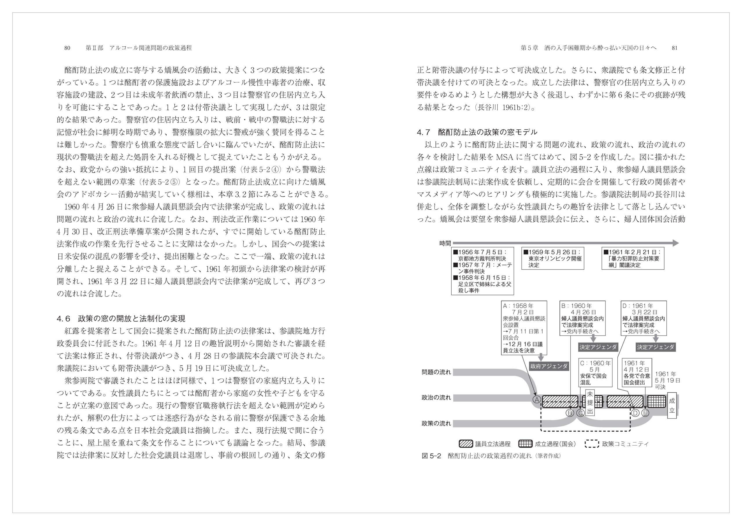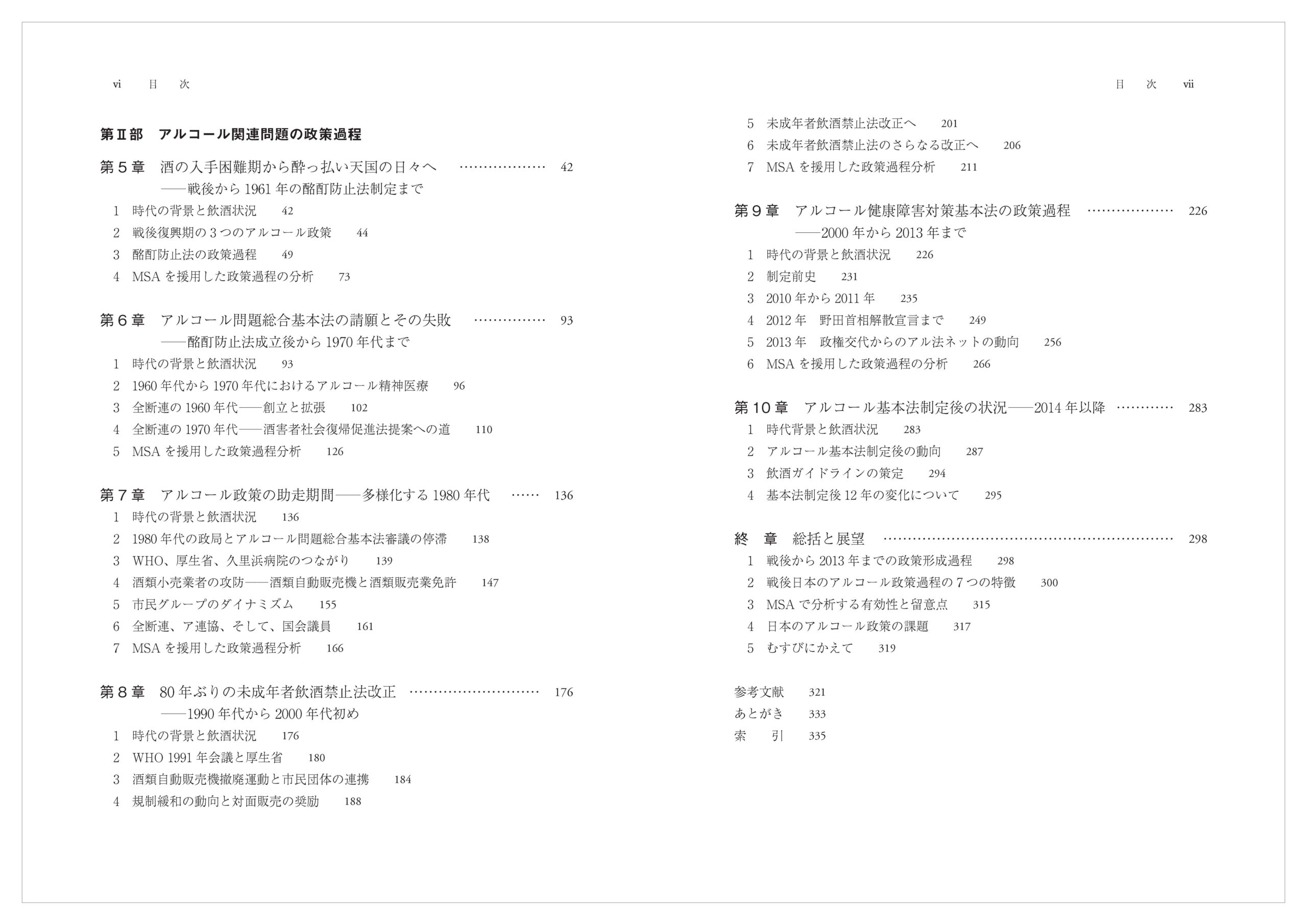 第II 部は「アルコール関連問題の政策過程」とし、年代ごとに期間を区切り、MSA を援用してアルコール政策過程を分析する。対象とする期間は、第5 章が戦後から酩酊防止法制定(1961 年)まで、第6 章が酩酊防止法成立以降から1970 年代まで、第7 章が1980 年代の動向、第8 章が1990 年代から2000年代初めまでで、未成年者飲酒禁止法の改正を取り上げる。第9 章が2000 年代で、アルコール基本法の政策過程を分析する。第10 章では、アルコール基本法制定後の12 年間について述べる。そして最後に、終章で本書を通じて得られた戦後日本におけるアルコール政策過程の特徴を説明し、知見の包括的な考察によって今後の課題を示していく。