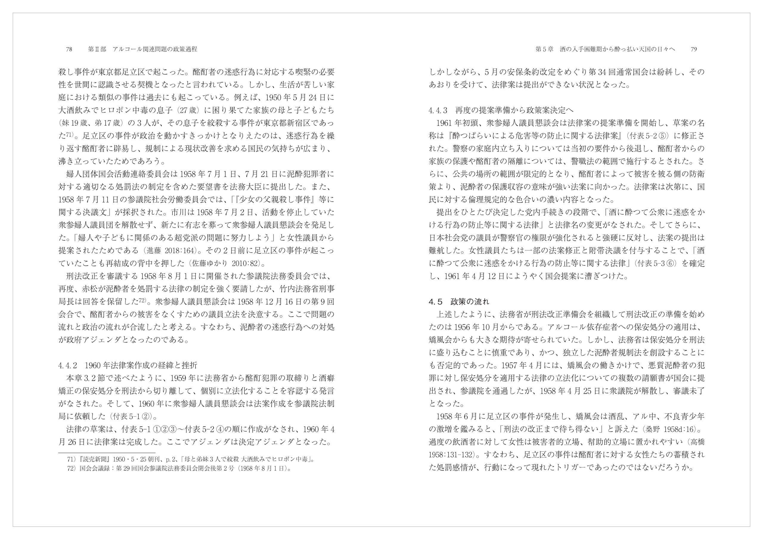 刑法改正を審議する1958 年8 月1 日に開催された参議院法務委員会では、再度、赤松が泥酔者を処罰する法律の制定を強く要請したが、竹内法務省刑事局長は回答を保留した。衆参婦人議員懇談会は1958 年12 月16 日の第9 回会合で、酩酊者からの被害をなくすための議員立法を決意する。ここで問題の流れと政治の流れが合流したと考える。すなわち、泥酔者の迷惑行為への対処が政府アジェンダとなったのである。