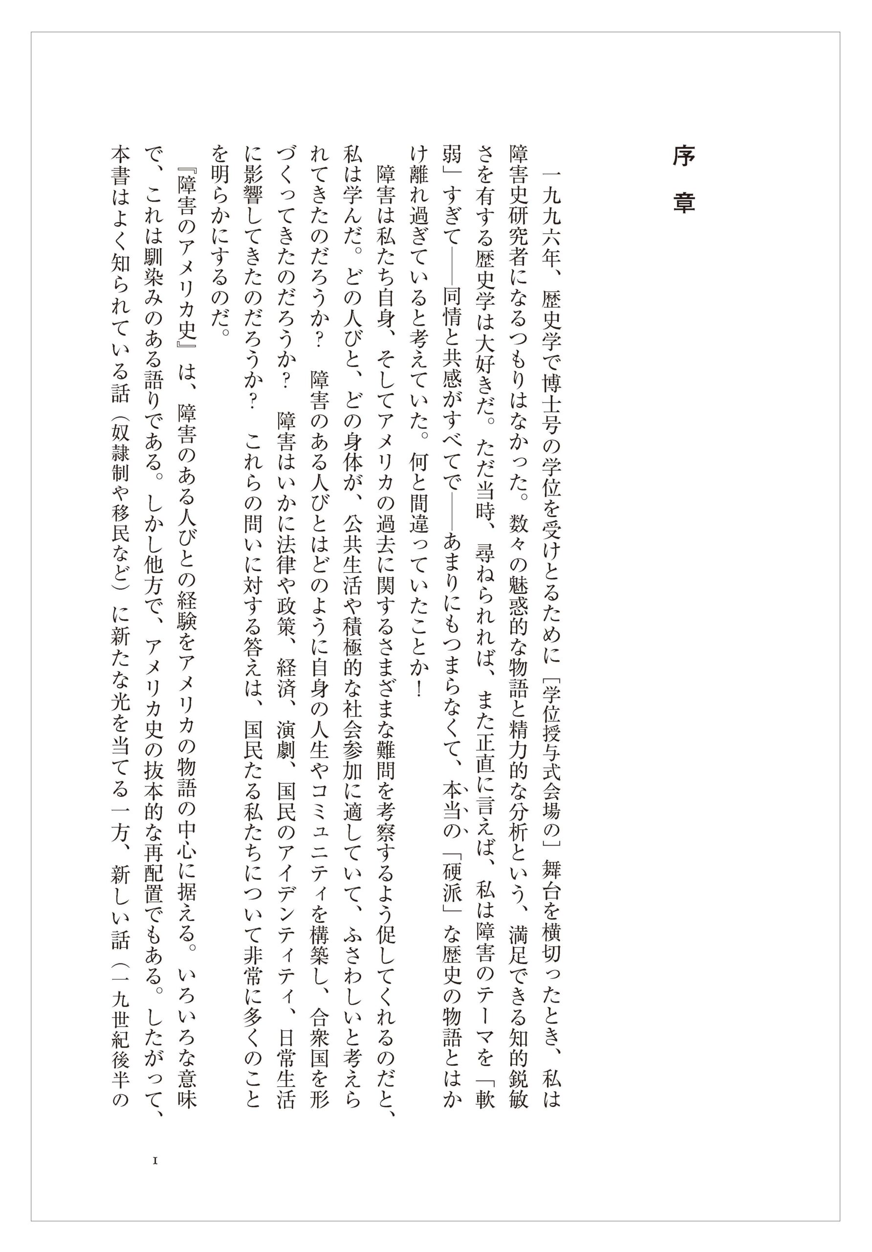 発展し続ける障害史研究や、障害者を対象とした伝記や回想録の人気の高まりにもかかわらず、誰ひとりとして、障害のある人びとの人生を通じて語られる広範囲のアメリカ通史の物語を世に送り出そうとはしてこなかった。『障害のアメリカ史』は、包括的な物語ではないものの、この空白を埋めようとするものである。障害の物語を語っていると自覚していた人もしていなかった人も含め、こうした他の人びとによる研究やアクティヴィズムや物語の記述がなければ、本書は完成できなかっただろう。