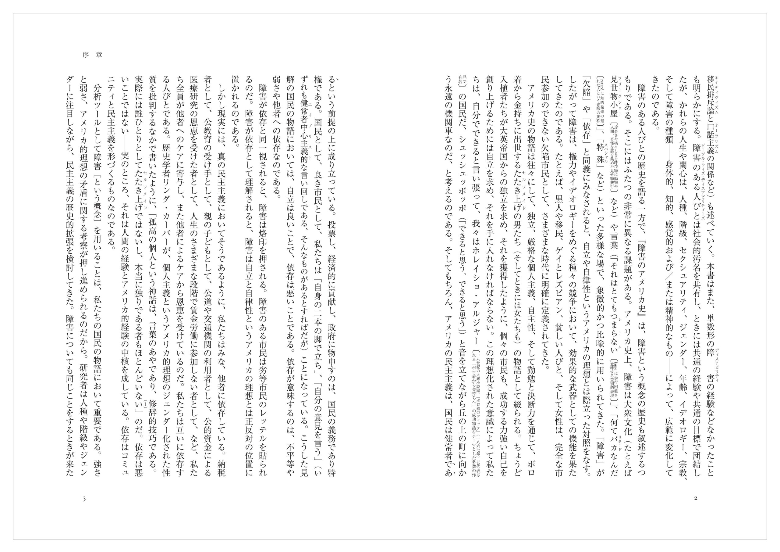 『障害のアメリカ史』は、障害のある人びとの経験をアメリカの物語の中心に据える。いろいろな意味で、これは馴染みのある語りである。しかし他方で、アメリカ史の抜本的な再配置でもある。したがって、本書はよく知られている話(奴隷制や移民など)に新たな光を当てる一方、新しい話(一九世紀後半の移民排斥論(ネイティヴィズム)と口話主義(オーラリズム)の関係など)も述べていく。本書はまた、単数形の障害(ディスアビリティ)の経験などなかったことも明らかにする。障害のある人びと(ピープル・ウィズ・ディスアビリティーズ)は社会的汚名を共有し、ときには共通の経験や共通の目標で団結したが、かれらの人生や関心は、人種、階級、セクシュアリティ、ジェンダー、年齢、イデオロギー、宗教、そして障害の種類――身体的、知的、感覚的および/または精神的なもの――によって、広範に変化してきたのである。