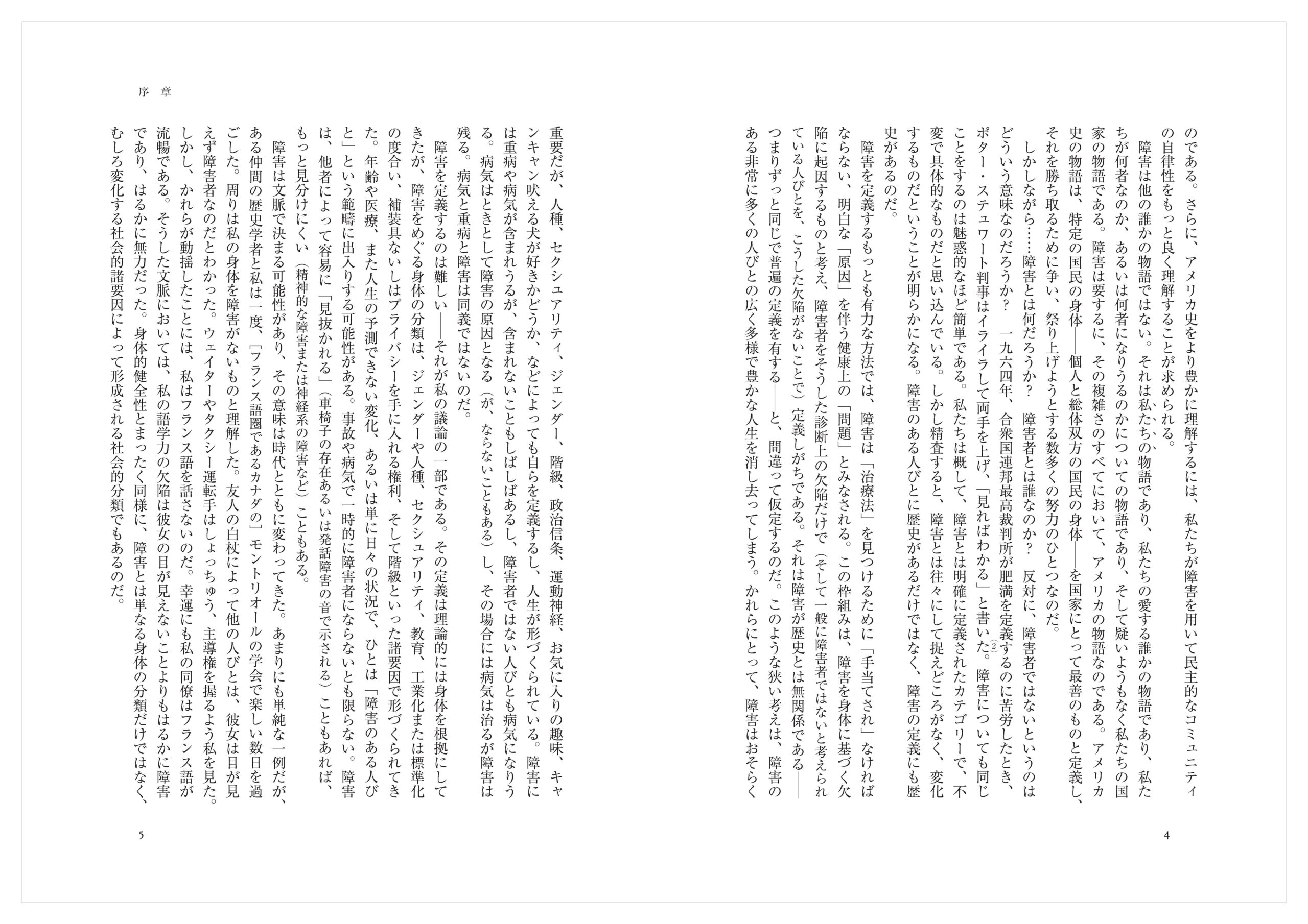 障害は他の誰かの物語ではない。それは私たちの物語であり、私たちの愛する誰かの物語であり、私たちが何者なのか、あるいは何者になりうるのかについての物語であり、そして疑いようもなく私たちの国家の物語である。障害は要するに、その複雑さのすべてにおいて、アメリカの物語なのである。アメリカ史の物語は、特定の国民の身体――個人と総体双方の国民の身体――を国家にとって最善のものと定義し、それを勝ち取るために争い、祭り上げようとする数多くの努力のひとつなのだ。
