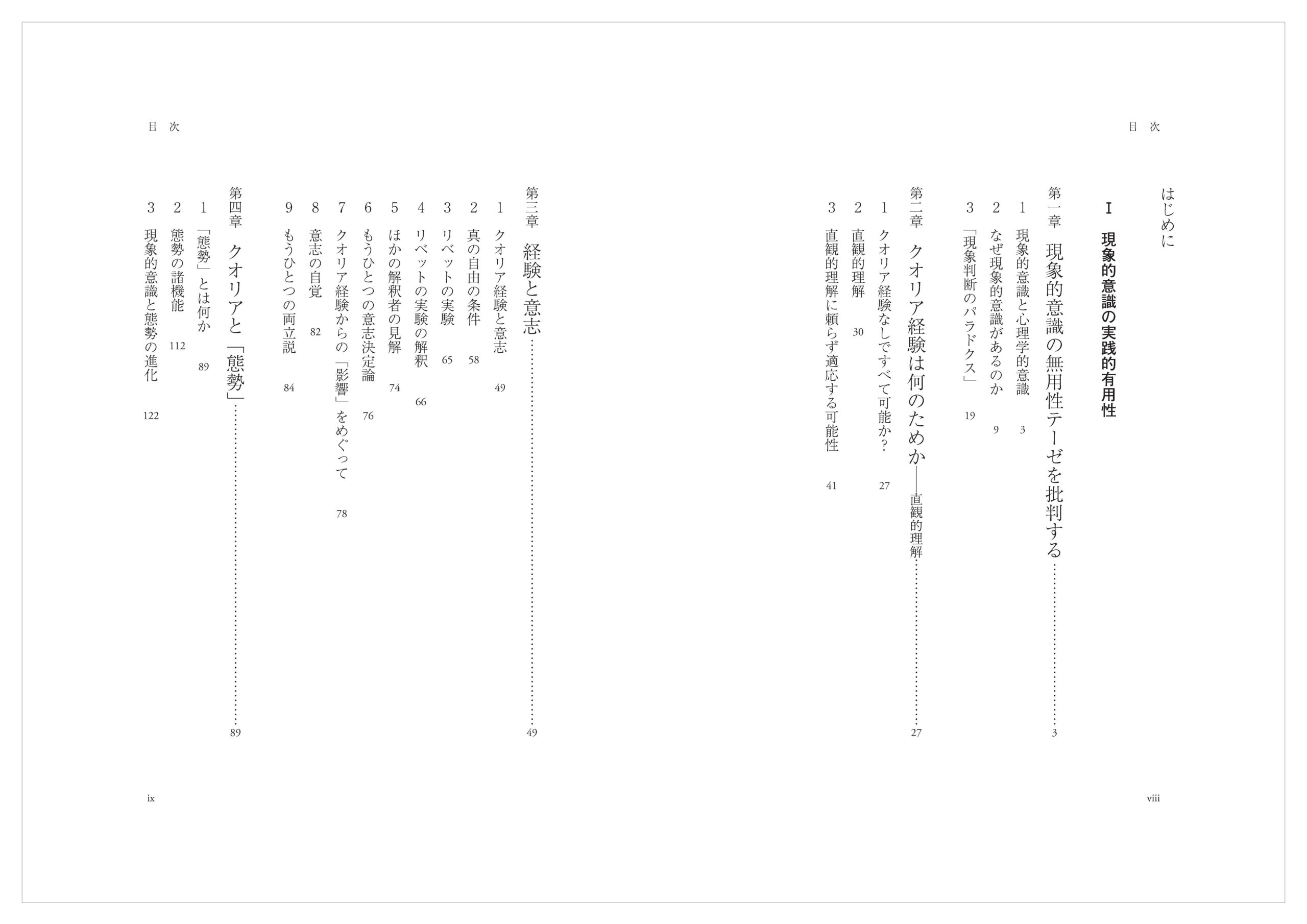 第五章ではここまで言及した以外の、意識によるクオリア経験の働きにあらためて触れる。対象知覚のカテゴリーを創出する働きのほか、知覚における真理性を主観的に保証する存在論的役割を担うなど、実は大きな役割を果たしている。意識は無用どころではないのである。