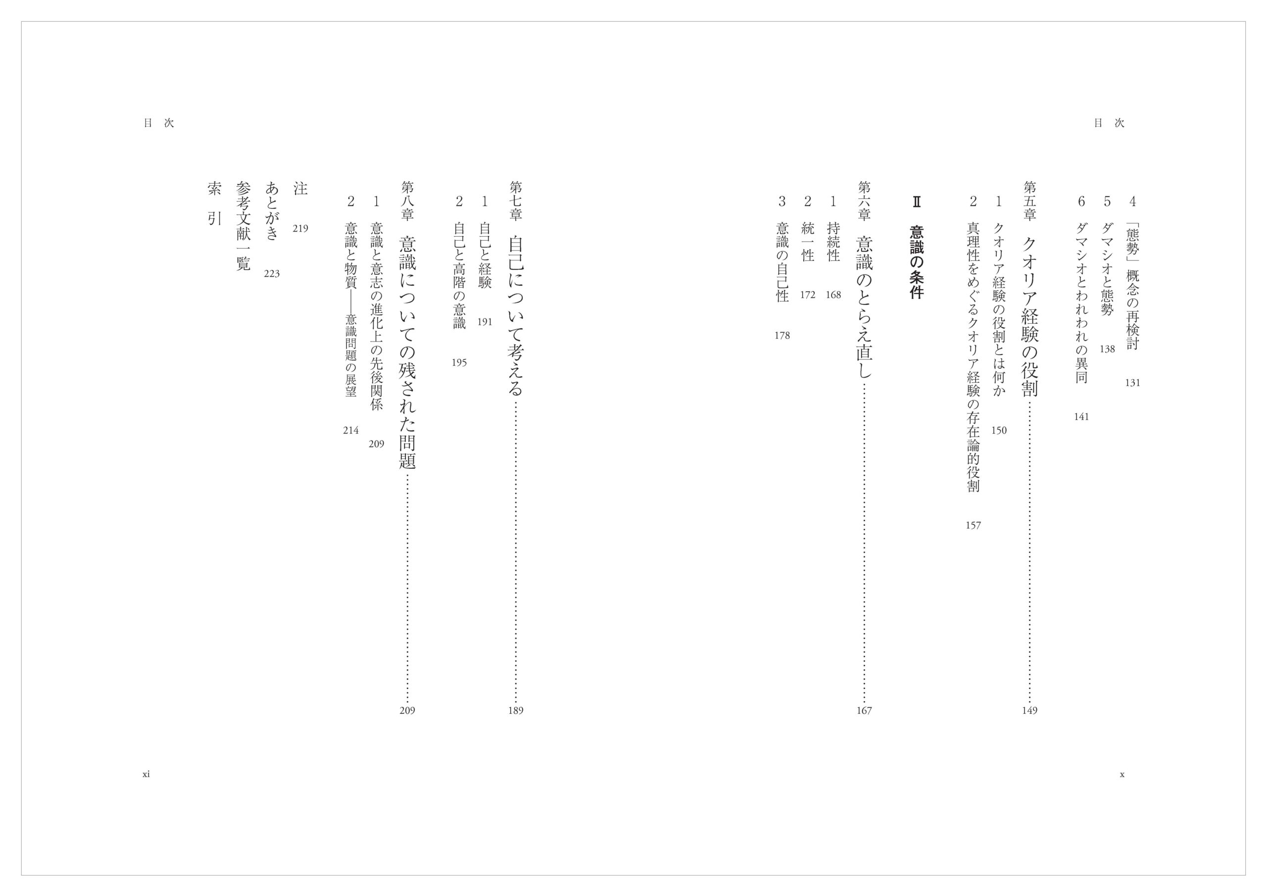 第六章、第七章では意識の全般的とらえ直しを試みる。意識は統一性をもつが、その具体的な様相として、時間・空間的統一性、自己の統一性を論じる。いずれにおいても意識が統一性を生みだす前提として、クオリアの経験(特に快苦)が利害を形作り、その利害の観点から統一性が必要とされてくる。利害と関係ないときには、統一性を生みだす理由もない。つまりこれらの統一は実践的な統一だということが明らかになる。そういう観点からすると、自己の統一は身体を含めた動物的・実践的統一である。