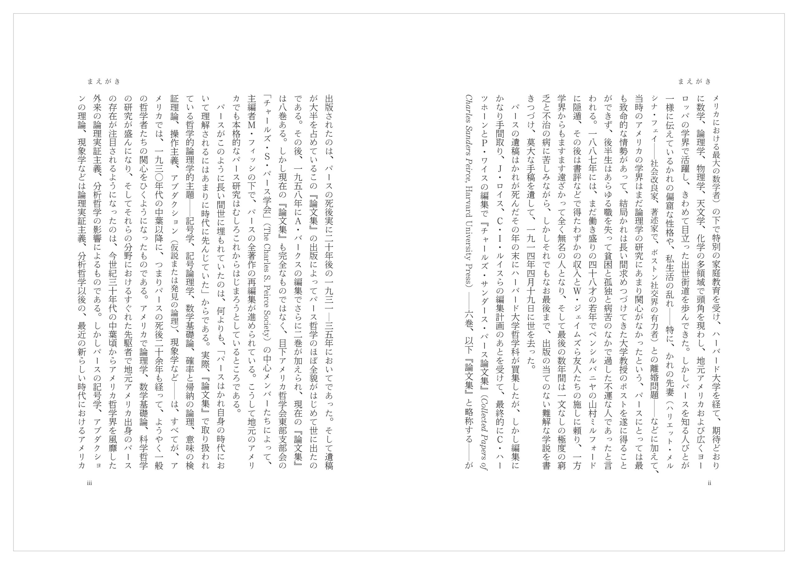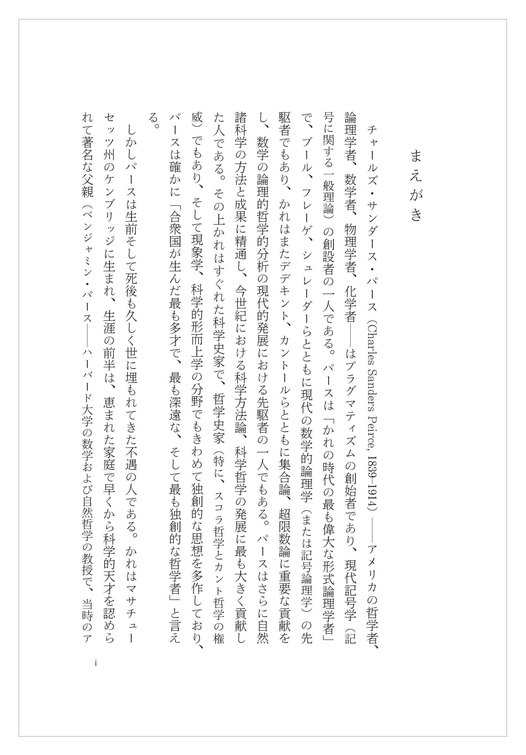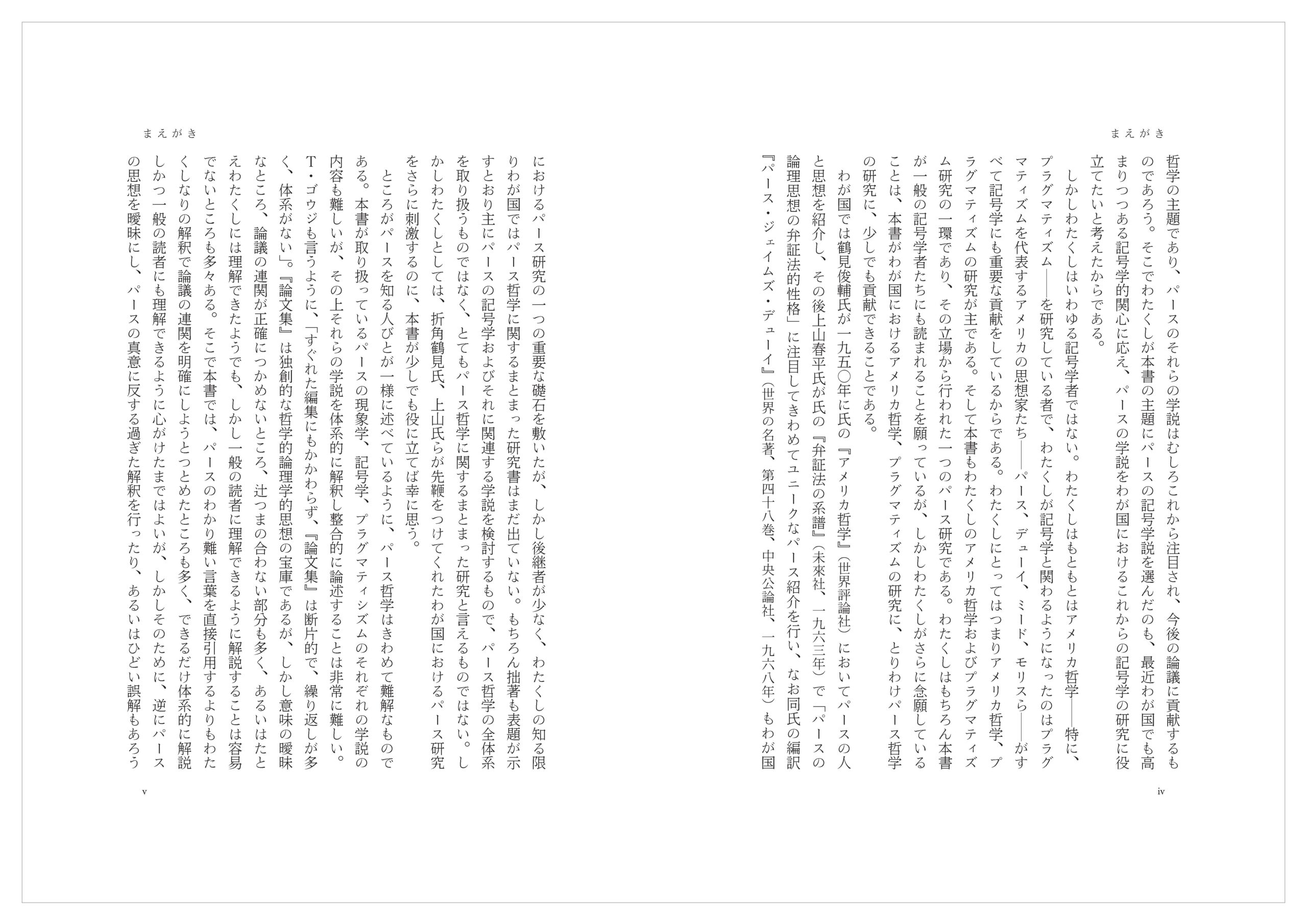 しかしわたくしはいわゆる記号学者ではない。わたくしはもともとはアメリカ哲学──特に、プラグマティズム──を研究している者で、わたくしが記号学と関わるようになったのはプラグマティズムを代表するアメリカの思想家たち──パース、デューイ、ミード、モリスら──がすべて記号学にも重要な貢献をしているからである。わたくしにとってはつまりアメリカ哲学、プラグマティズムの研究が主である。そして本書もわたくしのアメリカ哲学およびプラグマティズム研究の一環であり、その立場から行われた一つのパース研究である。わたくしはもちろん本書が一般の記号学者たちにも読まれることを願っているが、しかしわたくしがさらに念願していることは、本書がわが国におけるアメリカ哲学、プラグマティズムの研究に、とりわけパース哲学の研究に、少しでも貢献できることである。