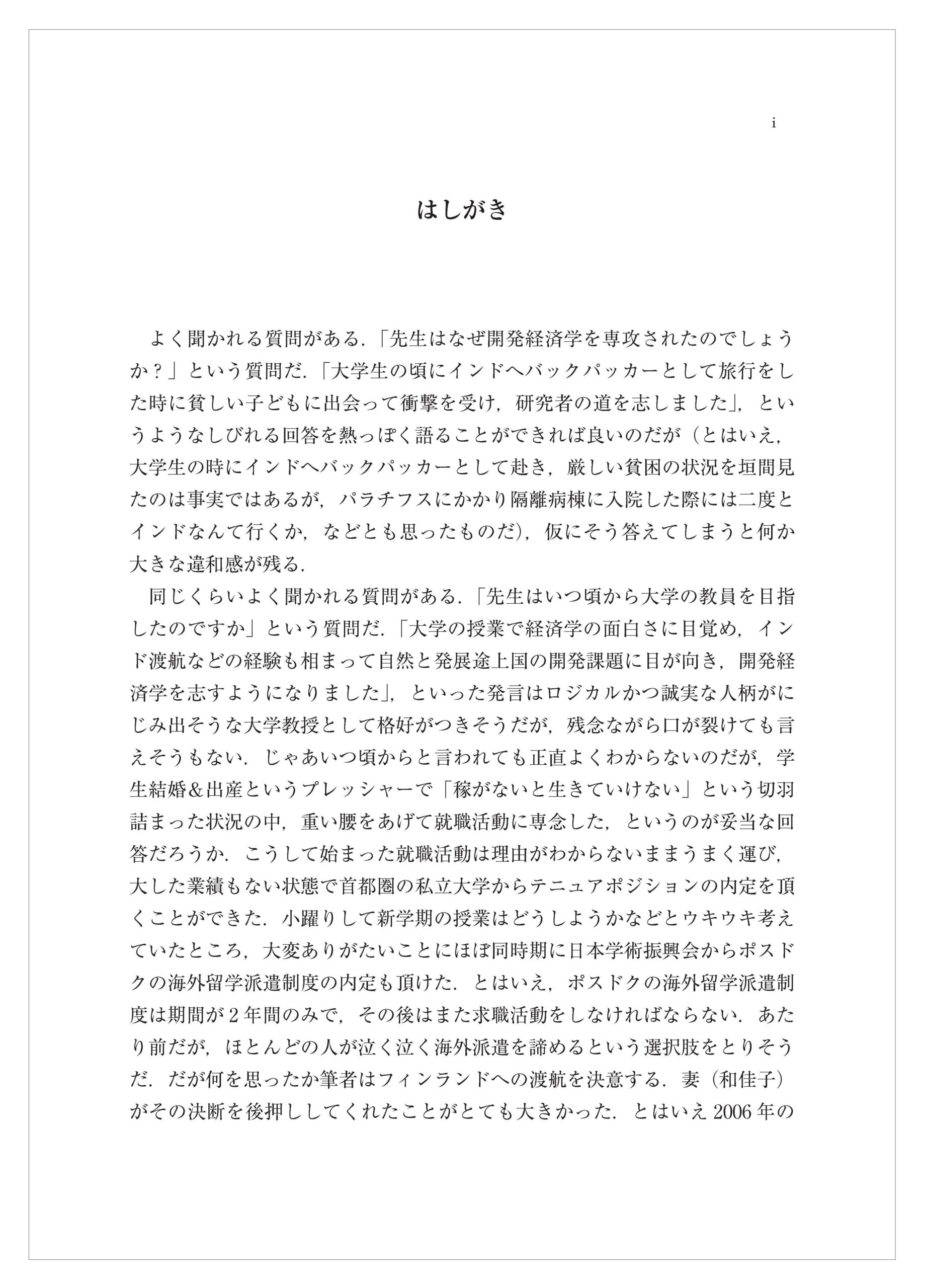 同じくらいよく聞かれる質問がある.「先生はいつ頃から大学の教員を目指したのですか」という質問だ.「大学の授業で経済学の面白さに目覚め,インド渡航などの経験も相まって自然と発展途上国の開発課題に目が向き,開発経済学を志すようになりました」,といった発言はロジカルかつ誠実な人柄がにじみ出そうな大学教授として格好がつきそうだが,残念ながら口が裂けても言えそうもない.じゃあいつ頃からと言われても正直よくわからないのだが,学生結婚&出産というプレッシャーで「稼がないと生きていけない」という切羽詰まった状況の中,重い腰をあげて就職活動に専念した,というのが妥当な回答だろうか.こうして始まった就職活動は理由がわからないままうまく運び,大した業績もない状態で首都圏の私立大学からテニュアポジションの内定を頂くことができた.小躍りして新学期の授業はどうしようかなどとウキウキ考えていたところ,大変ありがたいことにほぼ同時期に日本学術振興会からポスドクの海外留学派遣制度の内定も頂けた.とはいえ,ポスドクの海外留学派遣制度は期間が2 年間のみで,その後はまた求職活動をしなければならない.あたり前だが,ほとんどの人が泣く泣く海外派遣を諦めるという選択肢をとりそうだ.だが何を思ったか筆者はフィンランドへの渡航を決意する.妻(和佳子)がその決断を後押ししてくれたことがとても大きかった.とはいえ2006 年の11 月にまだ生後6 ヶ月の長男(相吾)と妻との3 人で降り立ったヘルシンキは氷点下の猛吹雪で,あのときは自分の選択を呪ったが,あの決断がなければ,この本を書くこともなかっただろうなと思う.