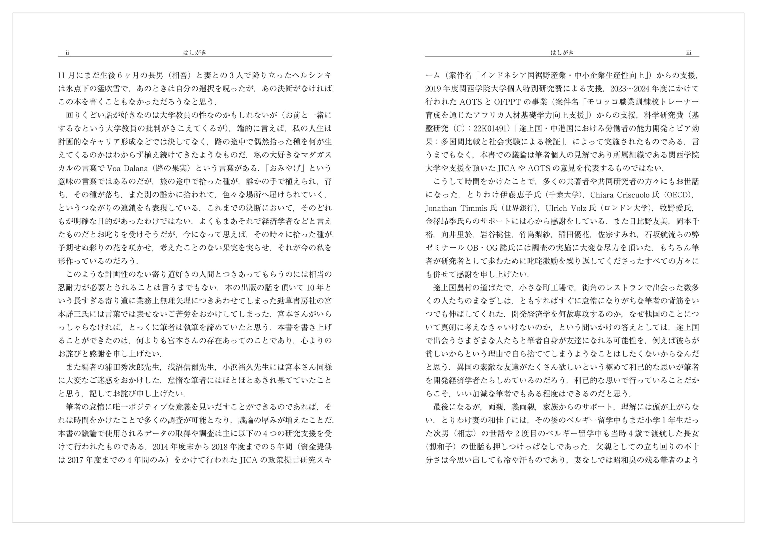 筆者の怠惰に唯一ポジティブな意義を見いだすことができるのであれば,それは時間をかけたことで多くの調査が可能となり,議論の厚みが増えたことだ.本書の議論で使用されるデータの取得や調査は主に以下の4 つの研究支援を受けて行われたものである.2014 年度末から2018 年度までの5 年間(資金提供は2017 年度までの4 年間のみ)をかけて行われたJICA の政策提言研究スキーム(案件名「インドネシア国裾野産業・中小企業生産性向上」)からの支援,2019 年度関西学院大学個人特別研究費による支援,2023~2024 年度にかけて行われたAOTS とOFPPT の事業(案件名「モロッコ職業訓練校トレーナー育成を通じたアフリカ人材基礎学力向上支援」)からの支援,科学研究費(基盤研究(C):22K01491)「途上国・中進国における労働者の能力開発とピア効果:多国間比較と社会実験による検証」,によって実施されたものである.言うまでもなく,本書での議論は筆者個人の見解であり所属組織である関西学院大学や支援を頂いたJICA やAOTS の意見を代表するものではない.