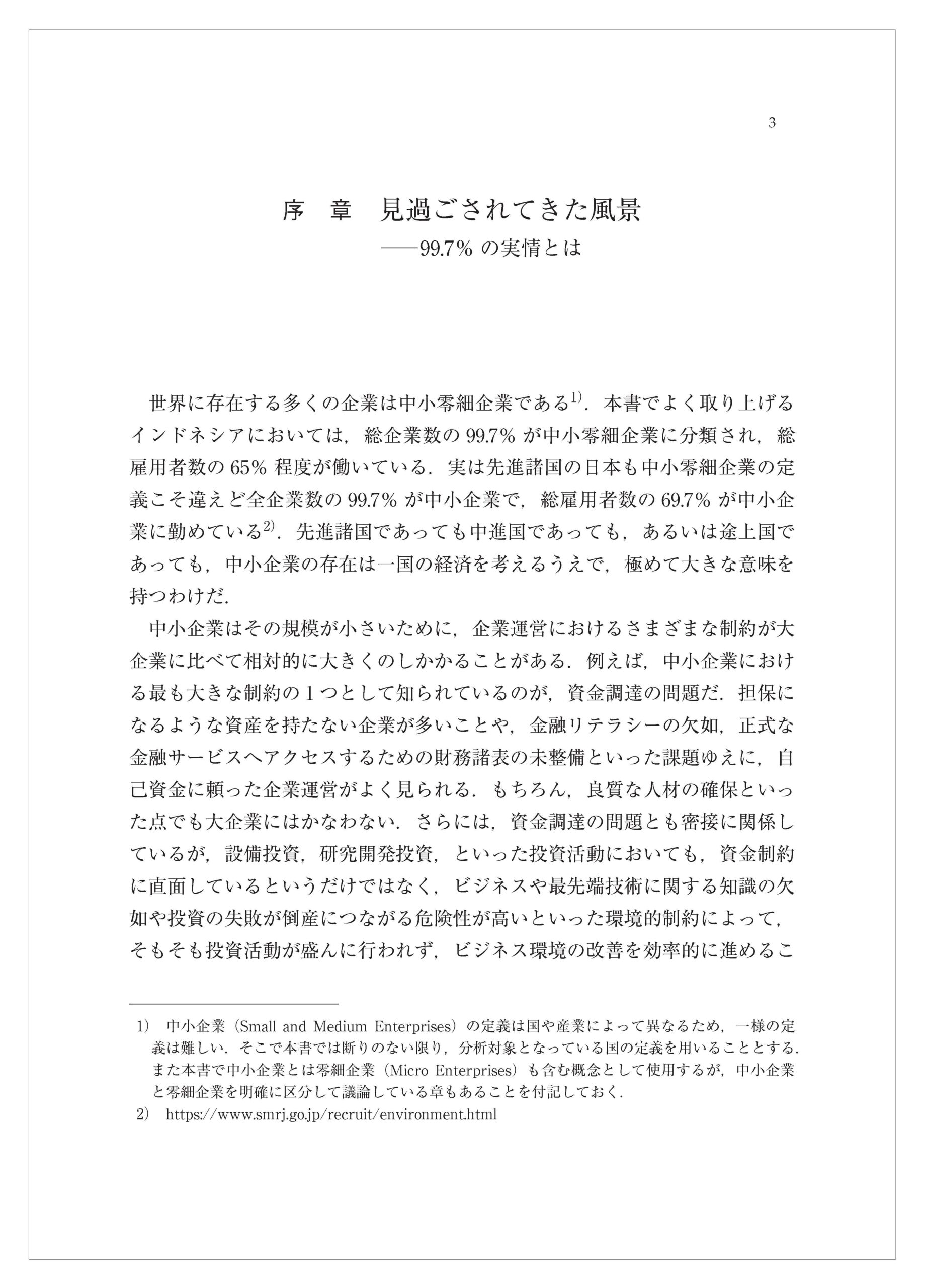 世界に存在する多くの企業は中小零細企業である.本書でよく取り上げるインドネシアにおいては,総企業数の99.7% が中小零細企業に分類され,総雇用者数の65% 程度が働いている.実は先進諸国の日本も中小零細企業の定義こそ違えど全企業数の99.7% が中小企業で,総雇用者数の69.7% が中小企業に勤めている.先進諸国であっても中進国であっても,あるいは途上国であっても,中小企業の存在は一国の経済を考えるうえで,極めて大きな意味を持つわけだ.