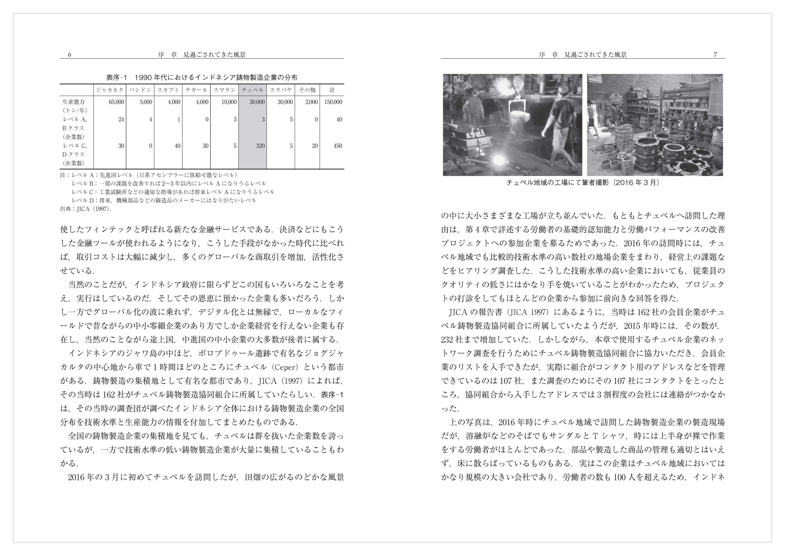 インドネシアのジャワ島の中ほど,ボロブドゥール遺跡で有名なジョグジャカルタの中心地から車で1 時間ほどのところにチュペル(Ceper)という都市がある.鋳物製造の集積地として有名な都市であり,JICA(1997)によれば,その当時は162 社がチュペル鋳物製造協同組合に所属していたらしい.表序─1は,その当時の調査団が調べたインドネシア全体における鋳物製造企業の全国分布を技術水準と生産能力の情報を付加してまとめたものである.
