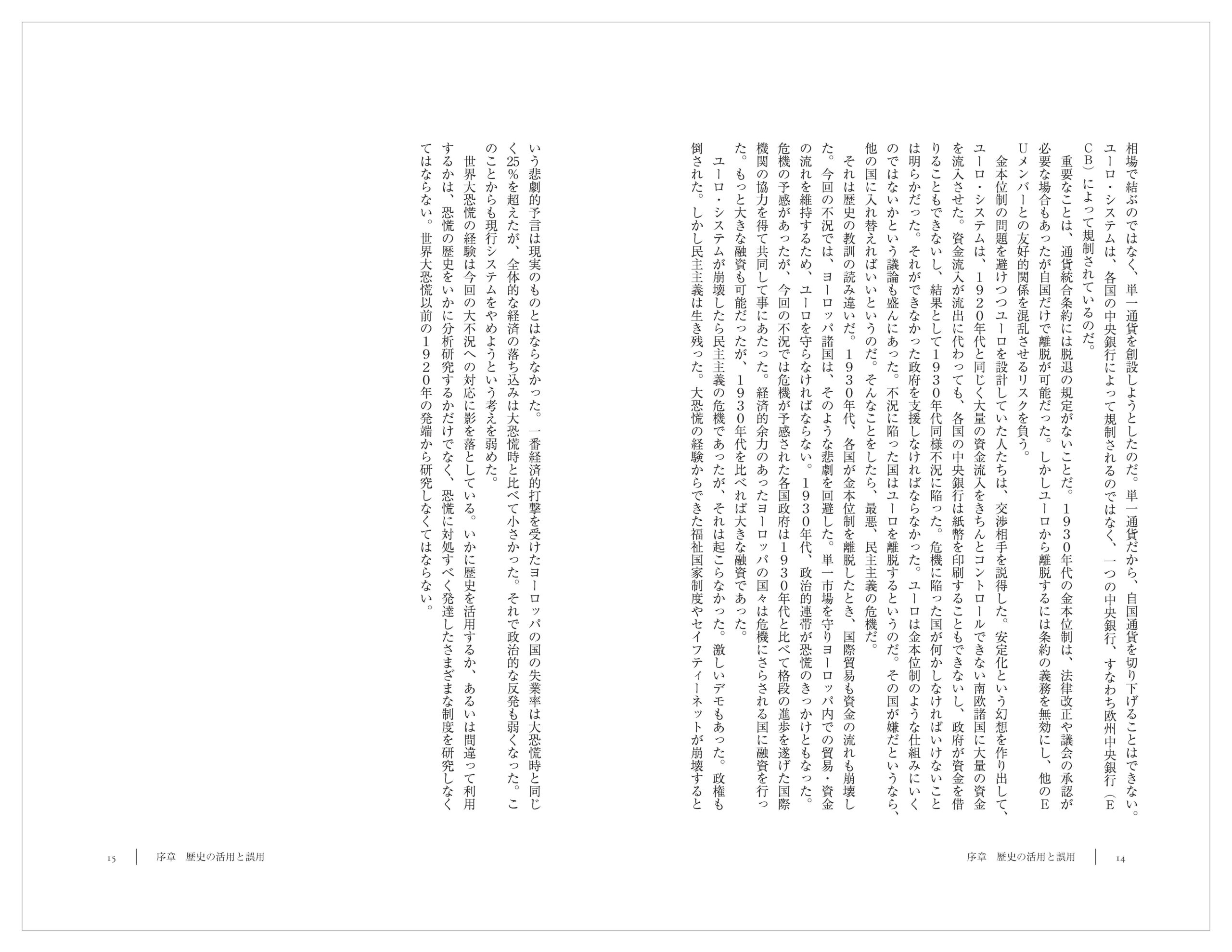 金本位制の問題を避けつつユーロを設計していた人たちは、交渉相手を説得した。安定化という幻想を作り出して、ユーロ・システムは、1920年代と同じく大量の資金流入をきちんとコントロールできない南欧諸国に大量の資金を流入させた。資金流入が流出に代わっても、各国の中央銀行は紙幣を印刷することもできないし、政府が資金を借りることもできないし、結果として1930年代同様不況に陥った。危機に陥った国が何かしなければいけないことは明らかだった。それができなかった政府を支援しなければならなかった。ユーロは金本位制のような仕組みにいくのではないかという議論も盛んにあった。不況に陥った国はユーロを離脱するというのだ。その国が嫌だというなら、他の国に入れ替えればいいというのだ。そんなことをしたら、最悪、民主主義の危機だ。