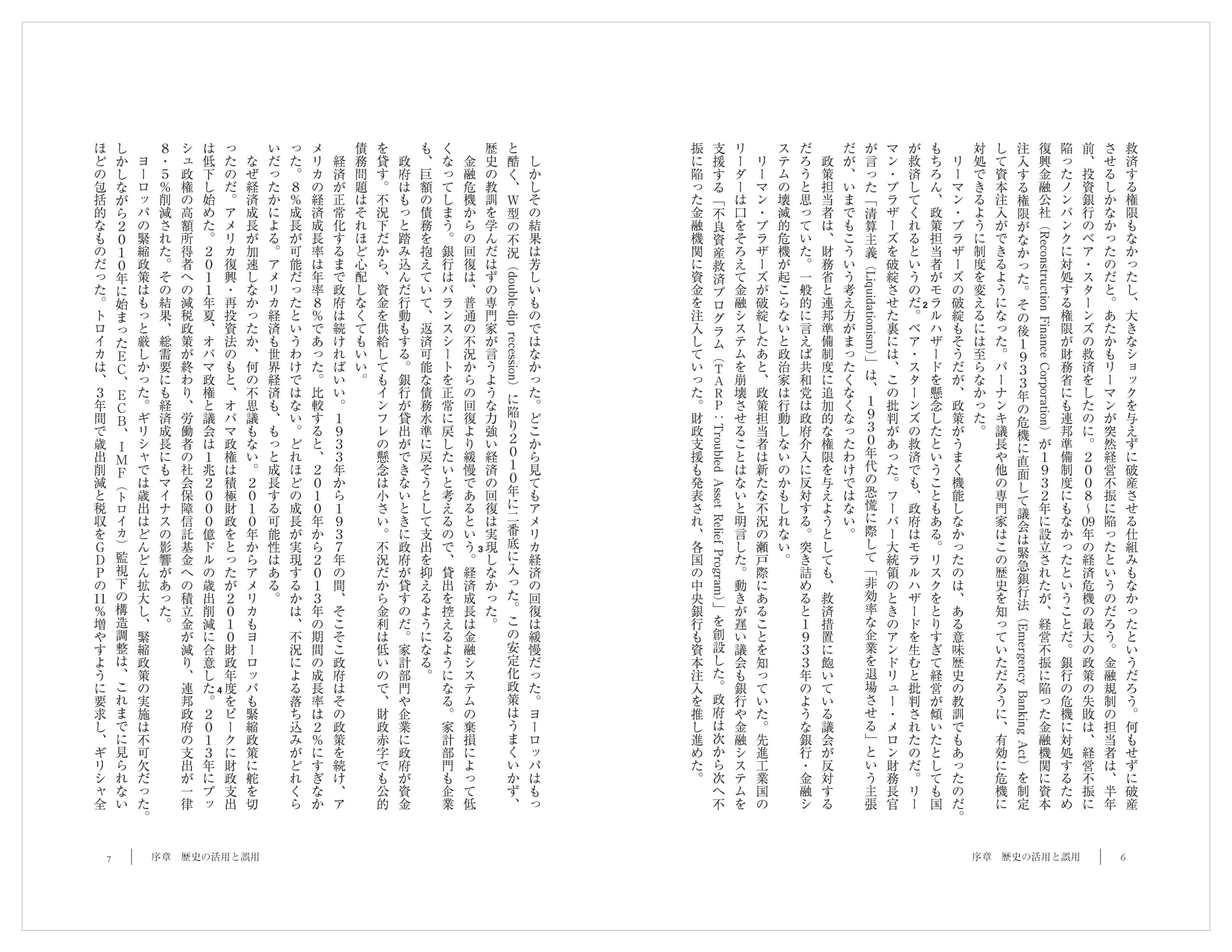 政策担当者が過去の失敗から教訓を得ていたので、最悪の事態は避けることができた。リーマン・ブラザーズが破綻して世界の金融システムは崖っぷちまで追い詰められたが、政策担当者はこれ以上巨大金融機関の破綻はさせないと明言し、実際そのとおりになった。1930年代、多くの政府は保護主義の誘惑に負け、近隣窮乏化政策がとられて、国際取引が急激に縮小した。各国政府は時代遅れの考えに支配されていて、最悪のときに公共支出を削減し、景気刺激が必要なときに均衡財政政策を実施した。減税も行った。大恐慌のとき、アメリカではハーバート・フーバーが、ドイツではハインリッヒ・ブリュニングがとった政策だ。このような政策がますます景気を悪化させ、公共政策に対する信認を回復することはできなかった。