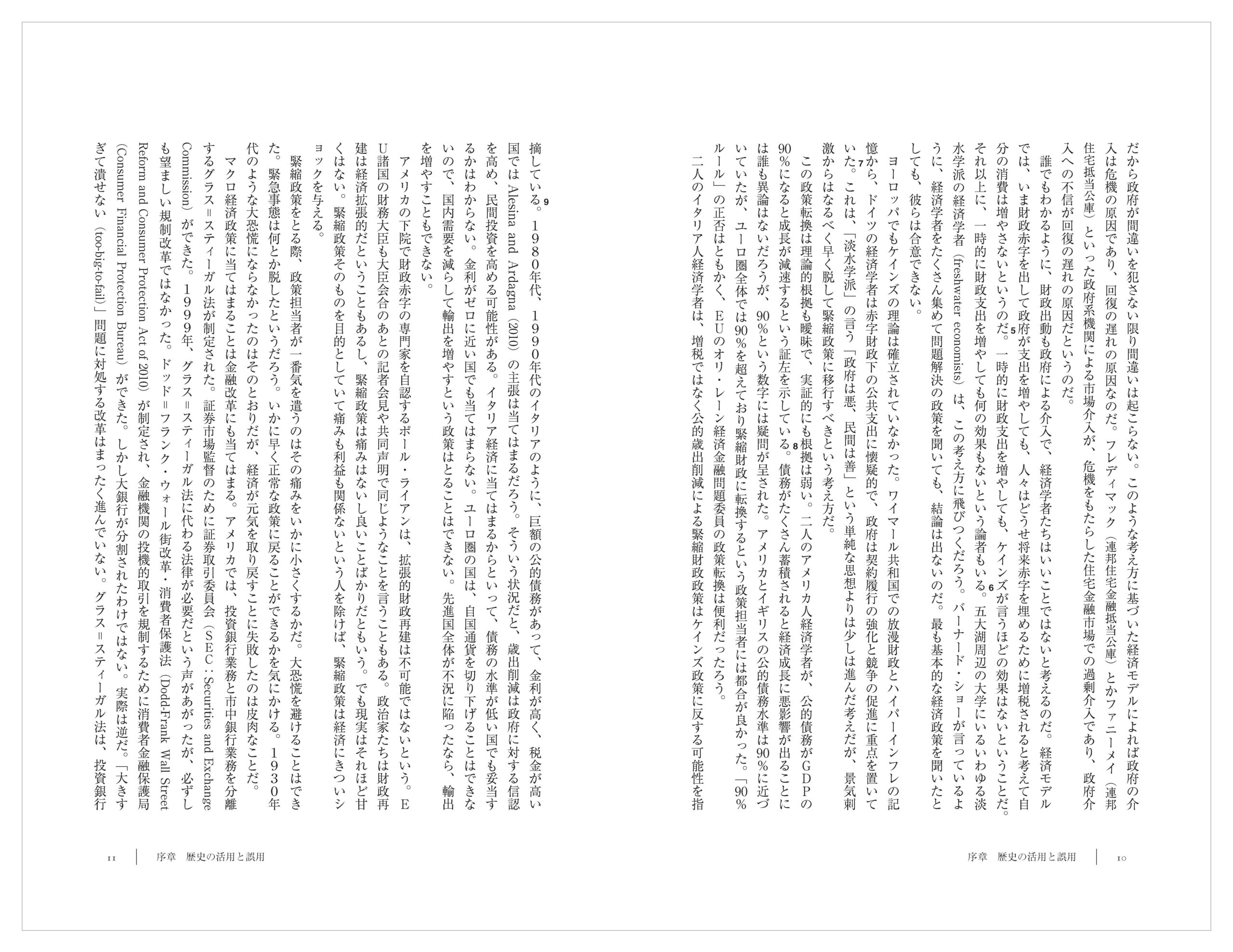 大恐慌の経験により、われわれはケインズをはじめとする多くの学者の研究から財政刺激策について学んだが、多くは忘れ去られてしまった。ケインズは主に言葉で経済を考えたが、その後の学者たちは、直感を数学的に証明することに力を注いだ。その結果、数学的分析そのものが意味ある分析のようになってしまった。アカデミックな研究は、一般的で、合理的で、操作しやすくて、エレガントなものになった。合理的主体は、すべて効率的に最大化するのだ。だから政府が間違いを犯さない限り間違いは起こらない。このような考え方に基づいた経済モデルによれば政府の介入は危機の原因であり、回復の遅れの原因なのだ。フレディマック(連邦住宅金融抵当公庫)とかファニーメイ(連邦住宅抵当公庫)といった政府系機関による市場介入が、危機をもたらした住宅金融市場での過剰介入であり、政府介入への不信が回復の遅れの原因だというのだ。
