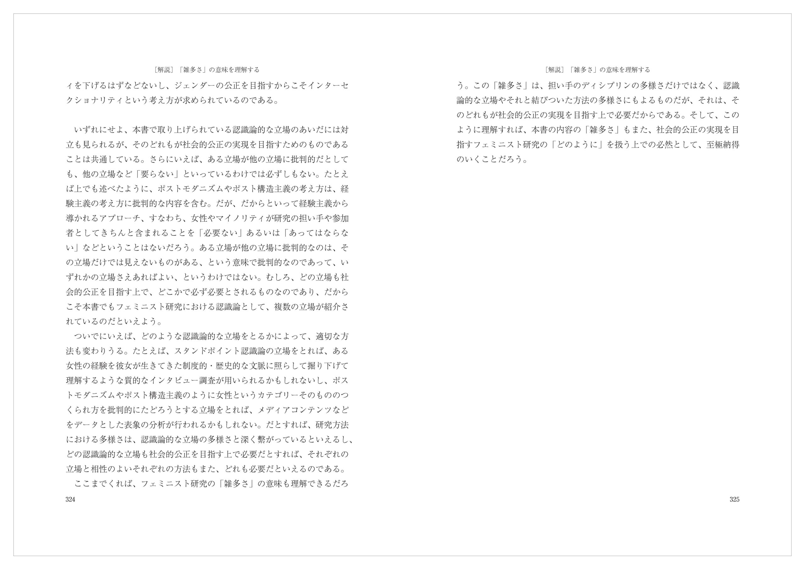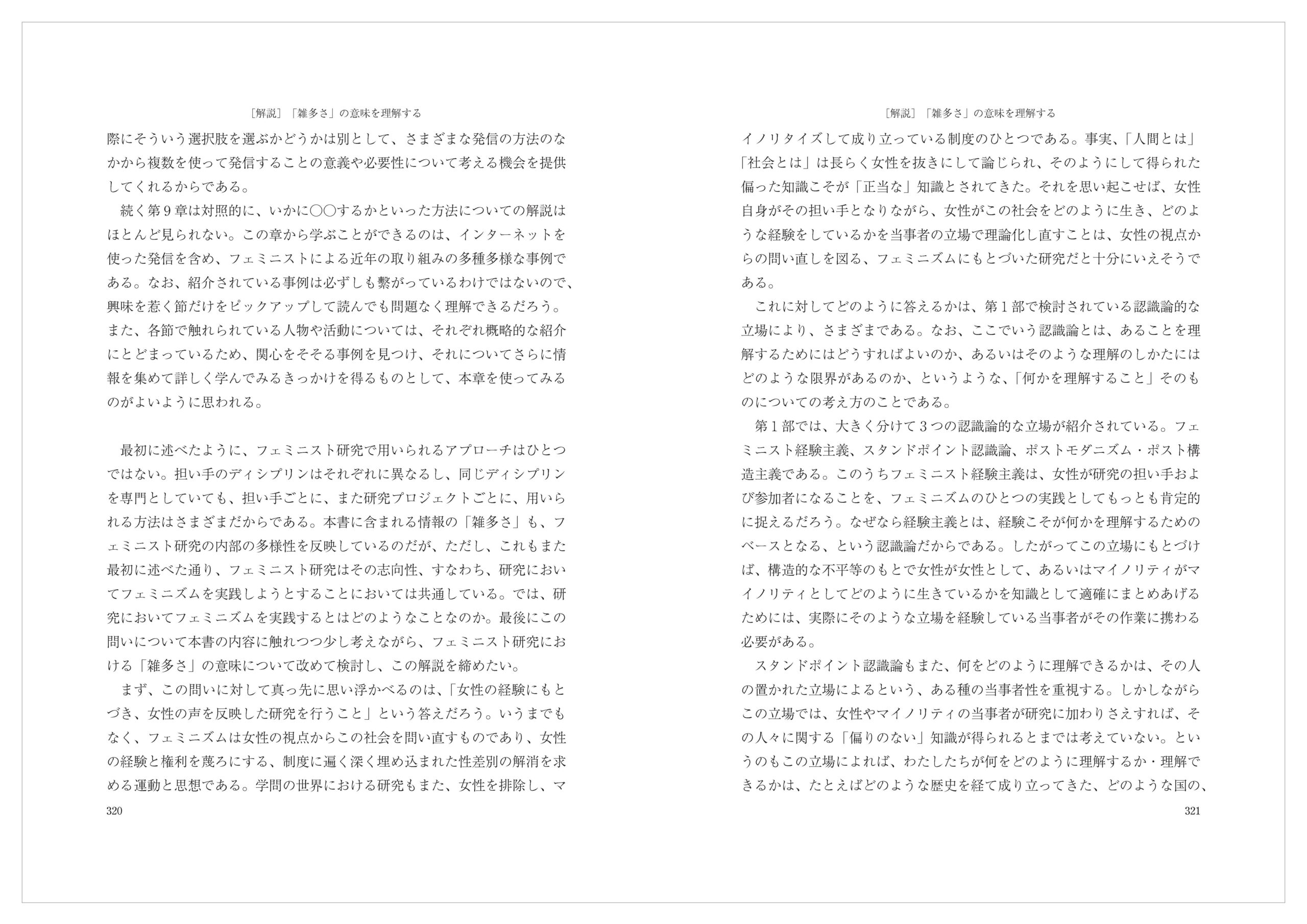 ここまでくれば、フェミニスト研究の「雑多さ」の意味も理解できるだろう。この「雑多さ」は、担い手のディシプリンの多様さだけではなく、認識論的な立場やそれと結びついた方法の多様さにもよるものだが、それは、そのどれもが社会的公正の実現を目指す上で必要だからである。そして、このように理解すれば、本書の内容の「雑多さ」もまた、社会的公正の実現を目指すフェミニスト研究の「どのように」を扱う上での必然として、至極納得のいくことだろう。