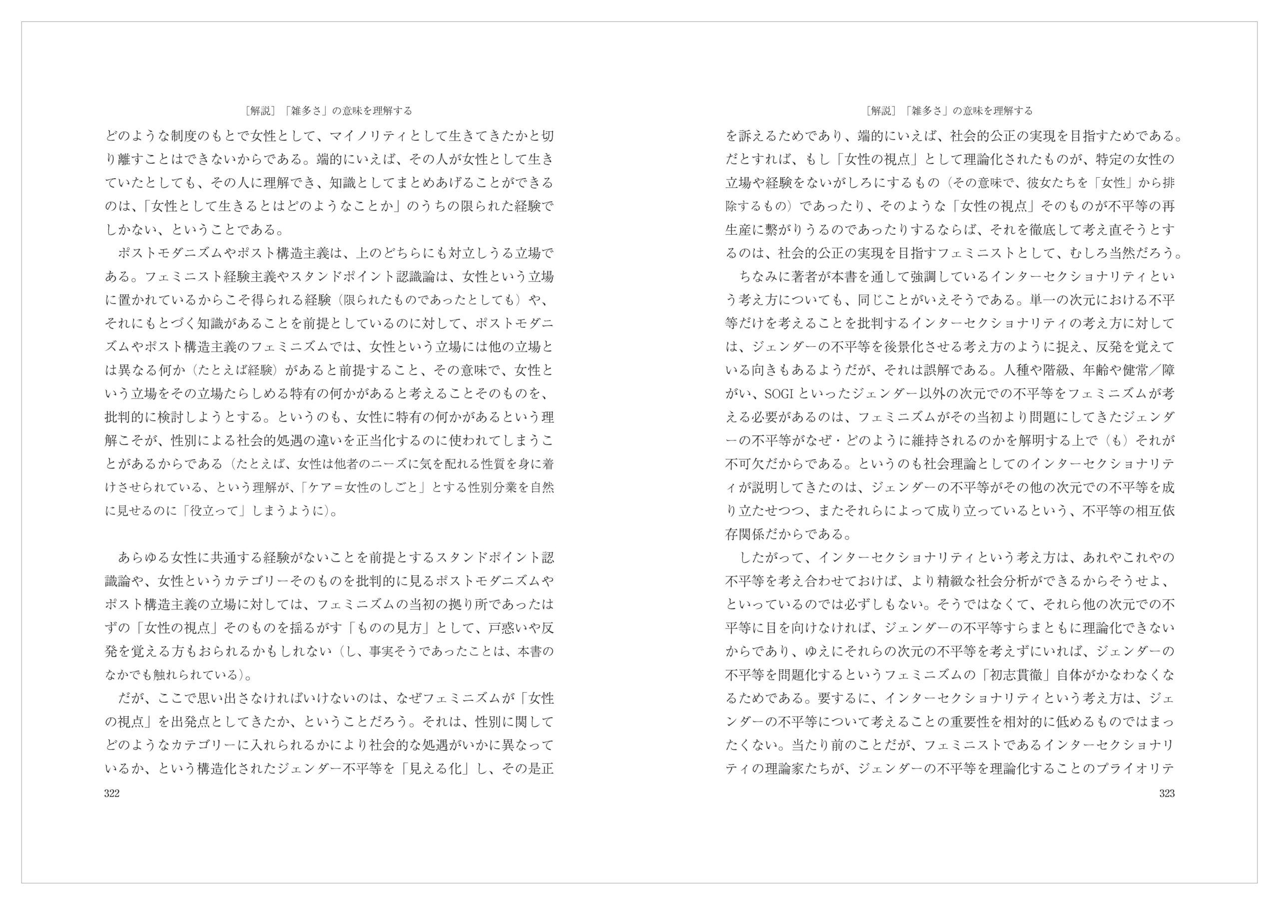 ちなみに著者が本書を通して強調しているインターセクショナリティという考え方についても、同じことがいえそうである。単一の次元における不平等だけを考えることを批判するインターセクショナリティの考え方に対しては、ジェンダーの不平等を後景化させる考え方のように捉え、反発を覚えている向きもあるようだが、それは誤解である。人種や階級、年齢や健常/障がい、SOGI といったジェンダー以外の次元での不平等をフェミニズムが考える必要があるのは、フェミニズムがその当初より問題にしてきたジェンダーの不平等がなぜ・どのように維持されるのかを解明する上で(も)それが不可欠だからである。というのも社会理論としてのインターセクショナリティが説明してきたのは、ジェンダーの不平等がその他の次元での不平等を成り立たせつつ、またそれらによって成り立っているという、不平等の相互依存関係だからである。