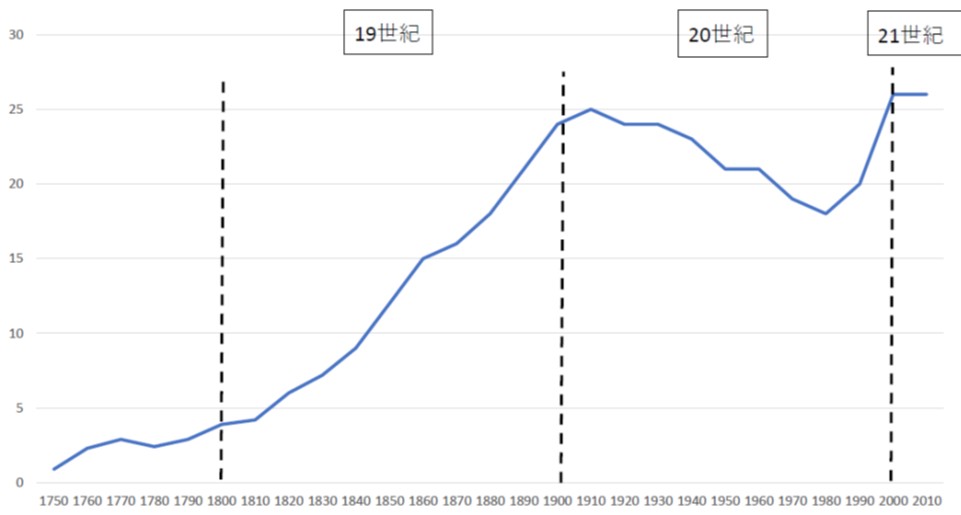 しかし、この傾向は、ちょうど世紀の変わり目の頃――アメリカにおいて、鉄道網の拡張に伴って形成されてきた種々のトラスト(企業間の結合関係)が問題視されるようになった頃――と軌を一にして歯止めがかかります。図1が示すように、20世紀は、一転して、platformの相対的利用頻度が低下を続けることとなったのです。自動車の時代であり、また、日本が経済成長を謳歌した時代でもあります。