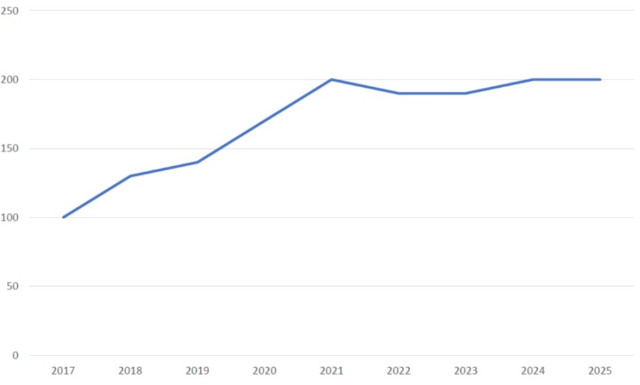 図2は、特にここ10年間でのplatformの相対的利用頻度の変遷を示したものです。21世紀初頭には、図1で見られるように、30回程度でしたが、2017年には100回となっており、2021年までに倍増しています。ただ、それ以降は、概ね200前後で推移をしており、増加の動きが止まっているように見えます。