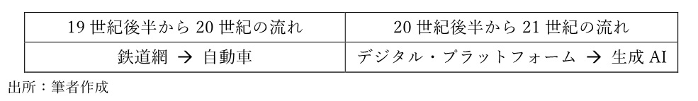 こうして、私たちは、120年の歳月を挟んで、鉄道網の完備によって生じた反トラストの流れと、デジタル・プラットフォームの定着に伴う競争政策的な対応の必要性を、platformの相対的な登場頻度の推移からパラレルで捉えることができるのです。更に大胆なパラレル化が許されるのであれば、表3のように、それは、20世紀と21世紀における基幹的、あるいは象徴的な産業の変遷を示唆しているとも言えるでしょう。