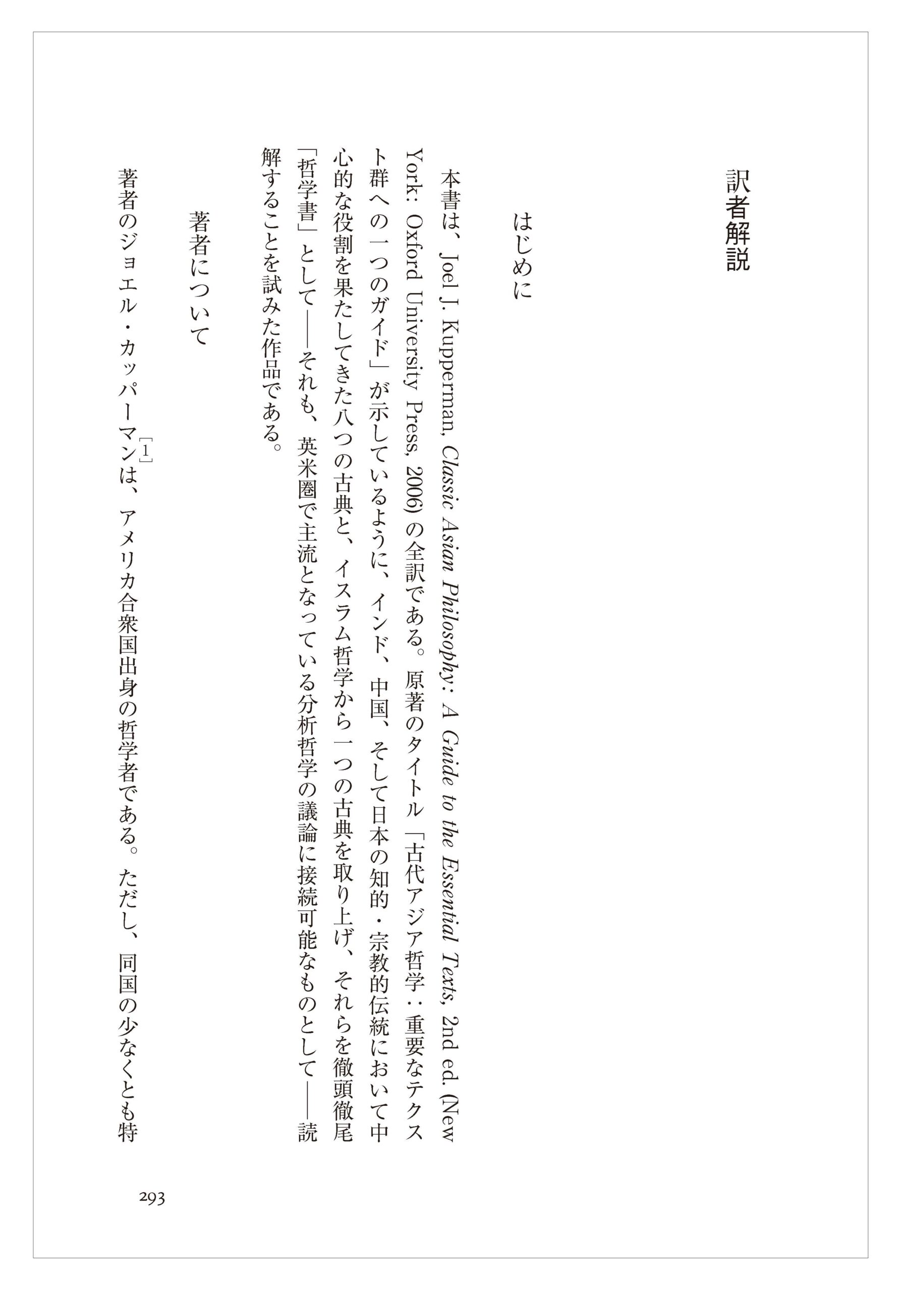 本書は、Joel J. Kupperman, Classic Asian Philosophy : A Guide to the Essential Texts, 2nd ed. (New York : Oxford University Press, 2006) の全訳である。原著のタイトル「古代アジア哲学:重要なテクスト群への一つのガイド」が示しているように、インド、中国、そして日本の知的・宗教的伝統において中心的な役割を果たしてきた八つの古典と、イスラム哲学から一つの古典を取り上げ、それらを徹頭徹尾「哲学書」として─それも、英米圏で主流となっている分析哲学の議論に接続可能なものとして─読解することを試みた作品である。
