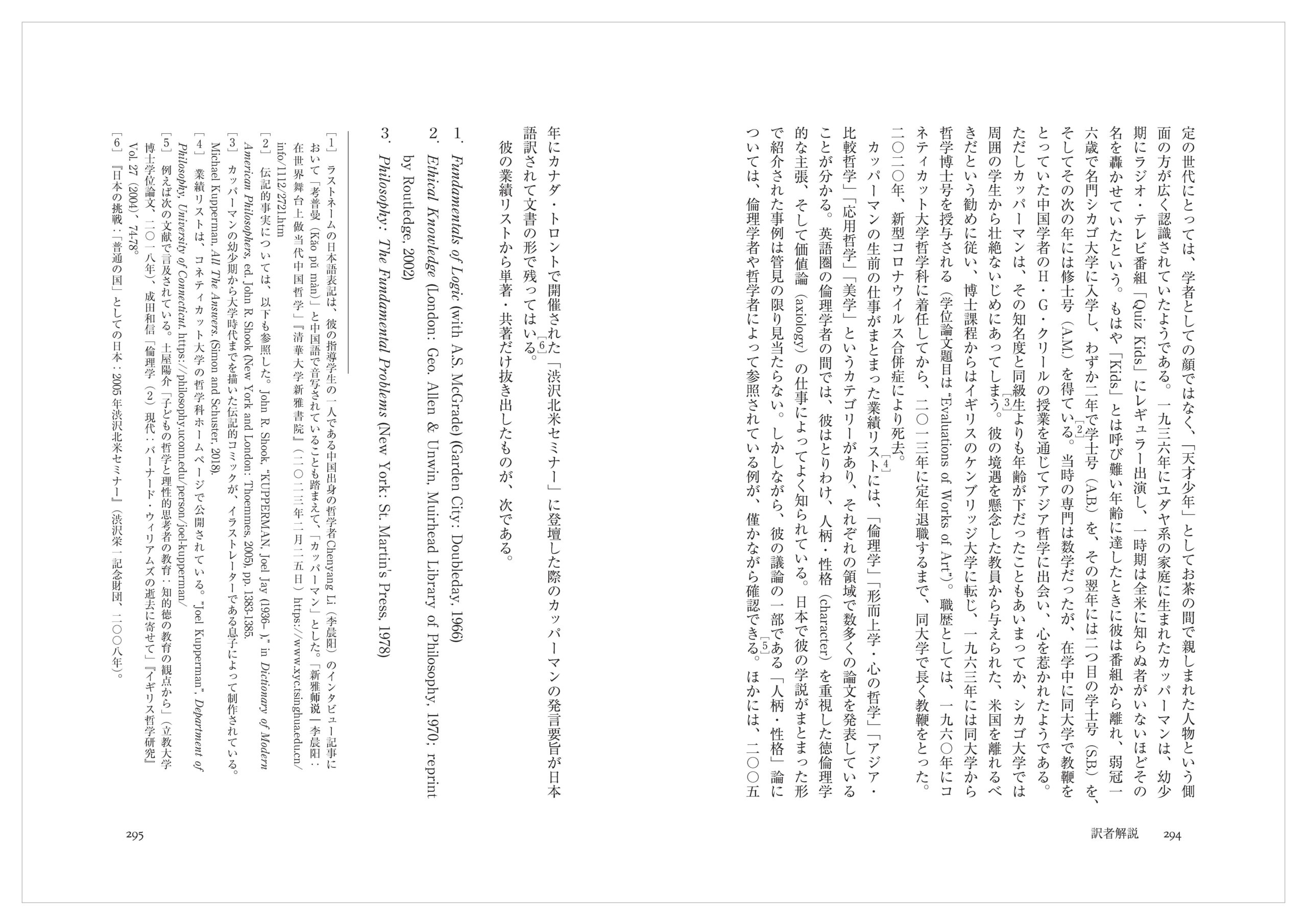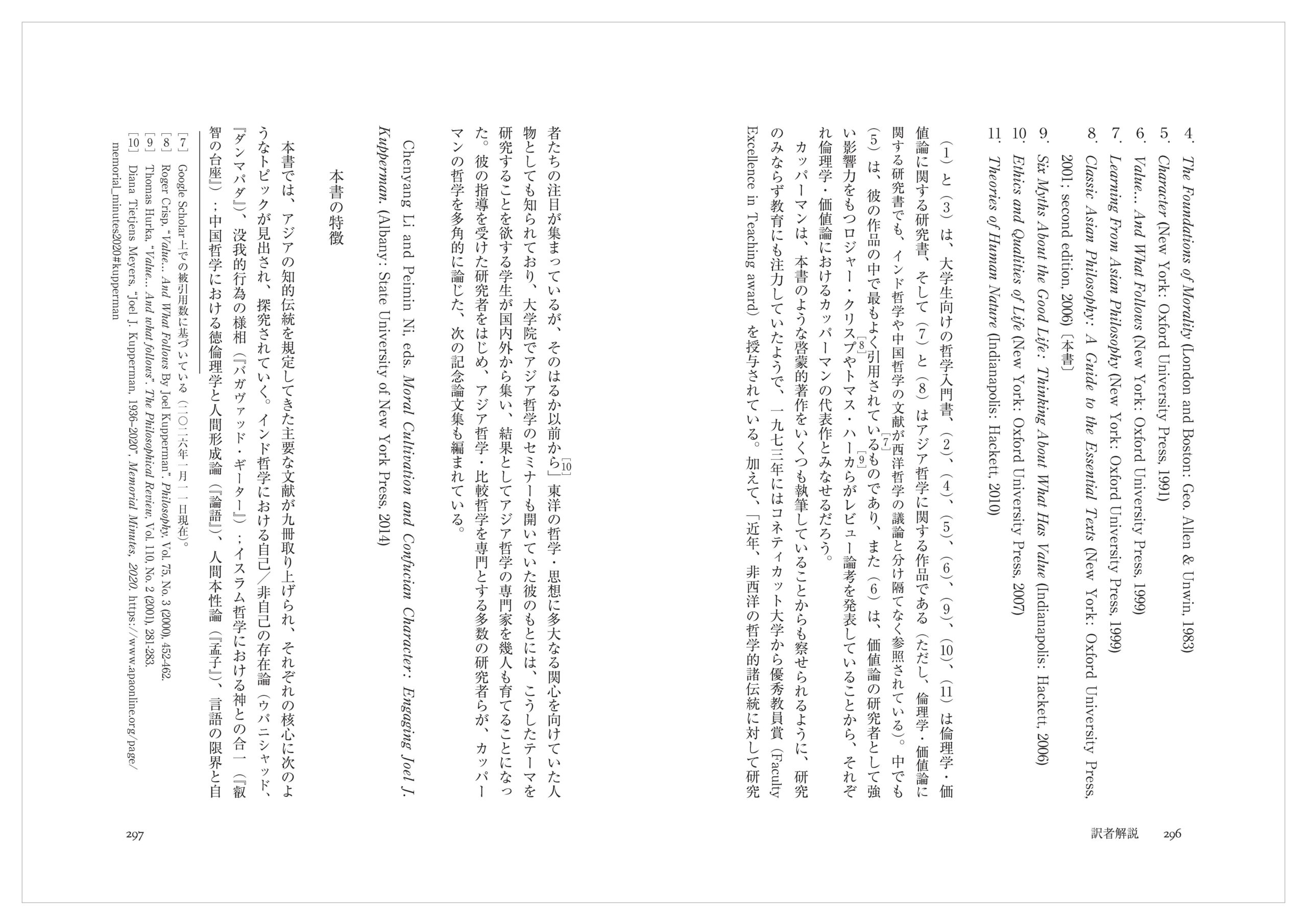 カッパーマンは、本書のような啓蒙的著作をいくつも執筆していることからも察せられるように、研究のみならず教育にも注力していたようで、一九七三年にはコネティカット大学から優秀教員賞(Faculty Excellence in Teaching award)を授与されている。加えて、「近年、非西洋の哲学的諸伝統に対して研究者たちの注目が集まっているが、そのはるか以前から」東洋の哲学・思想に多大なる関心を向けていた人物としても知られており、大学院でアジア哲学のセミナーも開いていた彼のもとには、こうしたテーマを研究することを欲する学生が国内外から集い、結果としてアジア哲学の専門家を幾人も育てることになった。彼の指導を受けた研究者をはじめ、アジア哲学・比較哲学を専門とする多数の研究者らが、カッパーマンの哲学を多角的に論じた、次の記念論文集も編まれている。