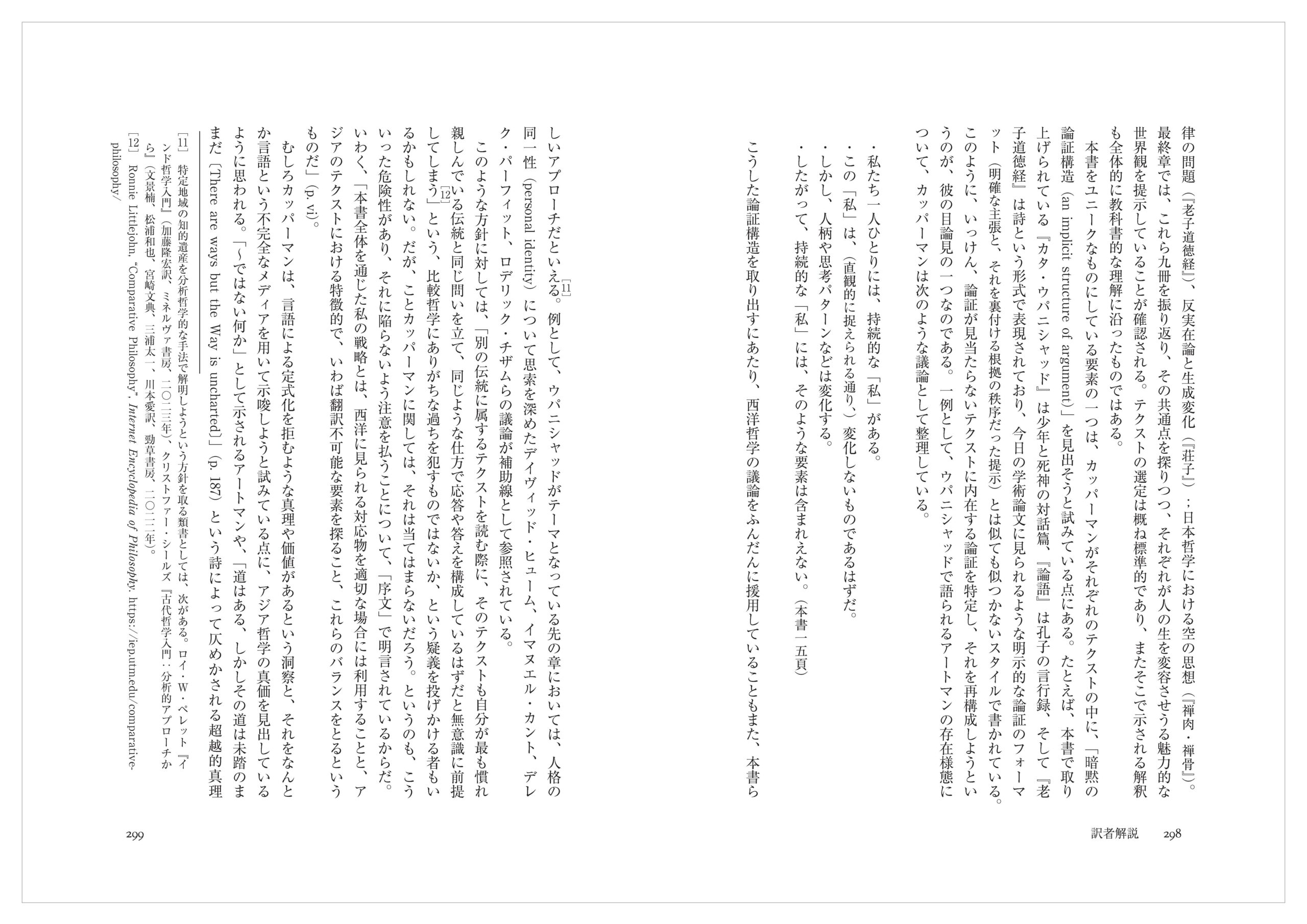 こうした論証構造を取り出すにあたり、西洋哲学の議論をふんだんに援用していることもまた、本書らしいアプローチだといえる。例として、ウパニシャッドがテーマとなっている先の章においては、人格の同一性(personal identity)について思索を深めたデイヴィッド・ヒューム、イマヌエル・カント、デレク・パーフィット、ロデリック・チザムらの議論が補助線として参照されている。