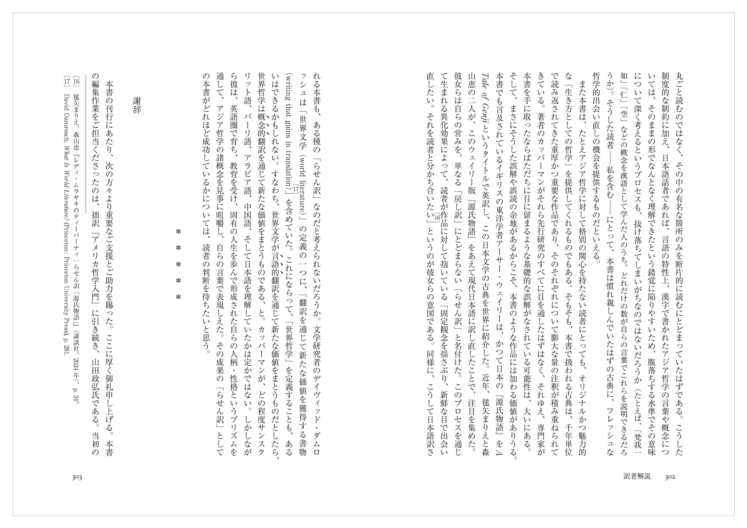 また本書は、たとえアジア哲学に対して格別の関心を持たない読者にとっても、オリジナルかつ魅力的な「生き方としての哲学」を提供してくれるものでもある。そもそも、本書で扱われる古典は、千年単位で読み返されてきた重厚かつ重要な作品であり、そのそれぞれについて膨大な量の注釈が積み重ねられてきている。著者のカッパーマンがそれら先行研究のすべてに目を通したはずはなく、それゆえ、専門家が本書を手に取ったならばただちに目に留まるような基礎的な誤解がなされている可能性は、大いにある。そして、まさにそうした誤解や誤読の余地があるからこそ、本書のような作品には加わる価値がありうる。本書でも言及されているイギリスの東洋学者アーサー・ウェイリーは、かつて日本の『源氏物語』をA Tale of Genji というタイトルで英訳し、この日本文学の古典を世界に紹介した。近年、毬矢まりえと森山恵の二人が、このウェイリー版『源氏物語』をあえて現代日本語に訳し直したことで、注目を集めた。彼女らは自らの営みを、単なる「戻し訳」にとどまらない「らせん訳」と名付けた。このプロセスを通じて生まれる異化効果によって、読者が作品に対して抱いている「固定観念を揺さぶり、新鮮な目で出会い直したい。それを読者と分かち合いたい」というのが彼女らの意図である。同様に、こうして日本語訳される本書も、ある種の「らせん訳」なのだと考えられないだろうか。文学研究者のデイヴィッド・ダムロッシュは「世界文学(world literature)」の定義の一つに、「翻訳を通じて新たな価値を獲得する書物(writing that gains in translation) 」を含めていた。これにならって、「世界哲学」を定義することも、あるいはできるかもしれない。すなわち、世界文学が言語的翻訳を通じて新たな価値をまとうものだとしたら、世界哲学は概念的翻訳を通じて新たな価値をまとうものである、と。カッパーマンが、どの程度サンスクリット語、パーリ語、アラビア語、中国語、そして日本語を理解していたかは定かではない。しかしながら彼は、英語圏で育ち、教育を受け、固有の人生を歩んで形成された自らの人柄・性格というプリズムを通して、アジア哲学の諸概念を見事に咀嚼し、自らの言葉で表現しえた。その成果の「らせん訳」としての本書がどれほど成功しているかについては、読者の判断を待ちたいと思う。