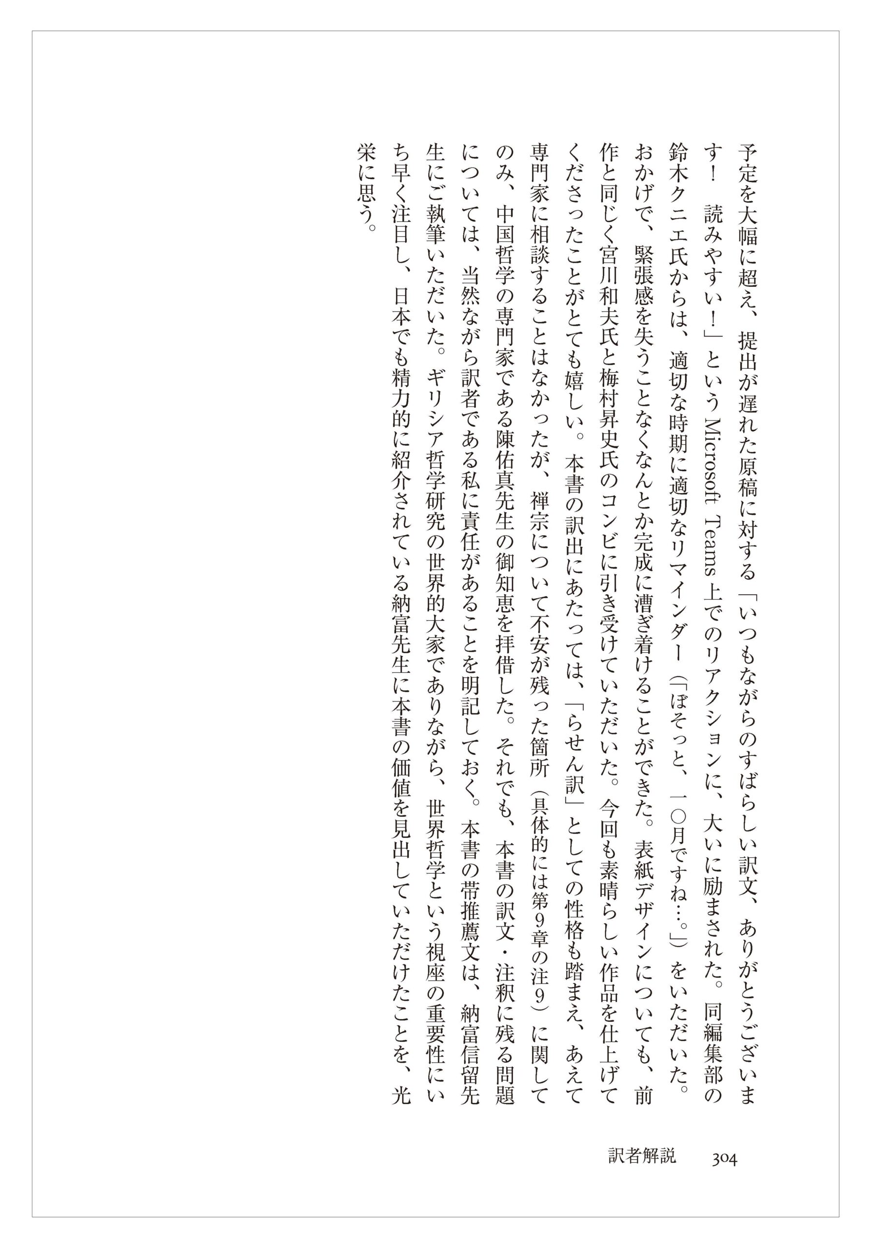 本書の刊行にあたり、次の方々より重要なご支援とご助力を賜った。ここに厚く御礼申し上げる。本書の編集作業をご担当くださったのは、拙訳『アメリカ哲学入門』に引き続き、山田政弘氏である。当初の予定を大幅に超え、提出が遅れた原稿に対する「いつもながらのすばらしい訳文、ありがとうございます! 読みやすい!」というMicrosoft Teams 上でのリアクションに、大いに励まされた。同編集部の鈴木クニエ氏からは、適切な時期に適切なリマインダー(「ぼそっと、一〇月ですね…。」)をいただいた。おかげで、緊張感を失うことなくなんとか完成に漕ぎ着けることができた。表紙デザインについても、前作と同じく宮川和夫氏と梅村昇史氏のコンビに引き受けていただいた。今回も素晴らしい作品を仕上げてくださったことがとても嬉しい。本書の訳出にあたっては、「らせん訳」としての性格も踏まえ、あえて専門家に相談することはなかったが、禅宗について不安が残った箇所(具体的には第9章の注9)に関してのみ、中国哲学の専門家である陳佑真先生の御知恵を拝借した。それでも、本書の訳文・注釈に残る問題については、当然ながら訳者である私に責任があることを明記しておく。本書の帯推薦文は、納富信留先生にご執筆いただいた。ギリシア哲学研究の世界的大家でありながら、世界哲学という視座の重要性にいち早く注目し、日本でも精力的に紹介されている納富先生に本書の価値を見出していただけたことを、光栄に思う。