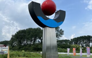 この不思議なモニュメントは、大潟村にある。ここはかつて日本で2番目に大きな湖、八郎潟だった。紅い球をつらぬく水平の棒が、海面の高さを表す。そう、ここはすべて海面より低い干拓地。 I came across this strange monument in Ōgata Village, Akita. This land was once Lake Hachirogata, Japan's second-largest lake. The horizontal iron rod piercing the red globe marks the sea level. Yes, this entire area is a polder---reclaimed land that is lower than the sea.